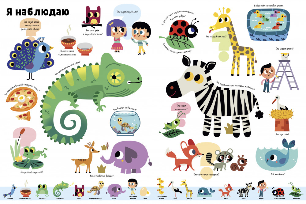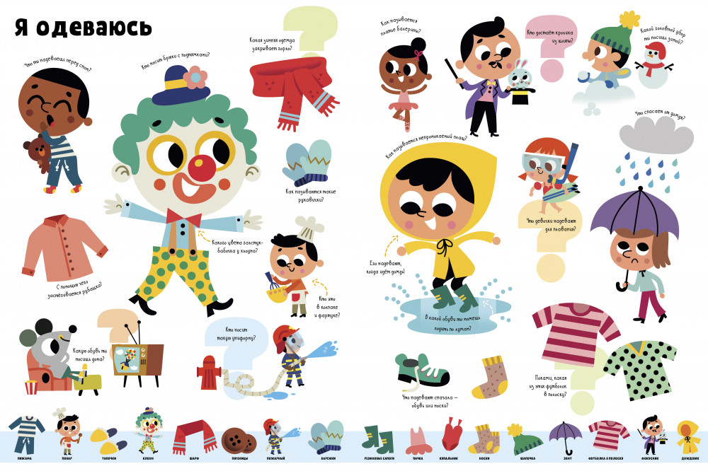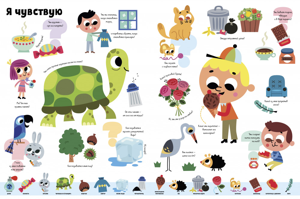 Играть с книгой-викториной можно вместе со взрослыми и самостоятельно: более 150 вопросов и сюжетные иллюстрации-подсказки позволят провести время весело и с пользой. Какая зимняя одежда закрывает горло, из чего делают йогурт, какое животное лает, что надевают сначала — носок или ботинок? Эти и сотни других вопросов нуждаются в правильном ответе! Что-то придется посчитать, а где-то найти отличия. Если вопрос оказался слишком сложным, на той же страничке внизу можно найти ответ.