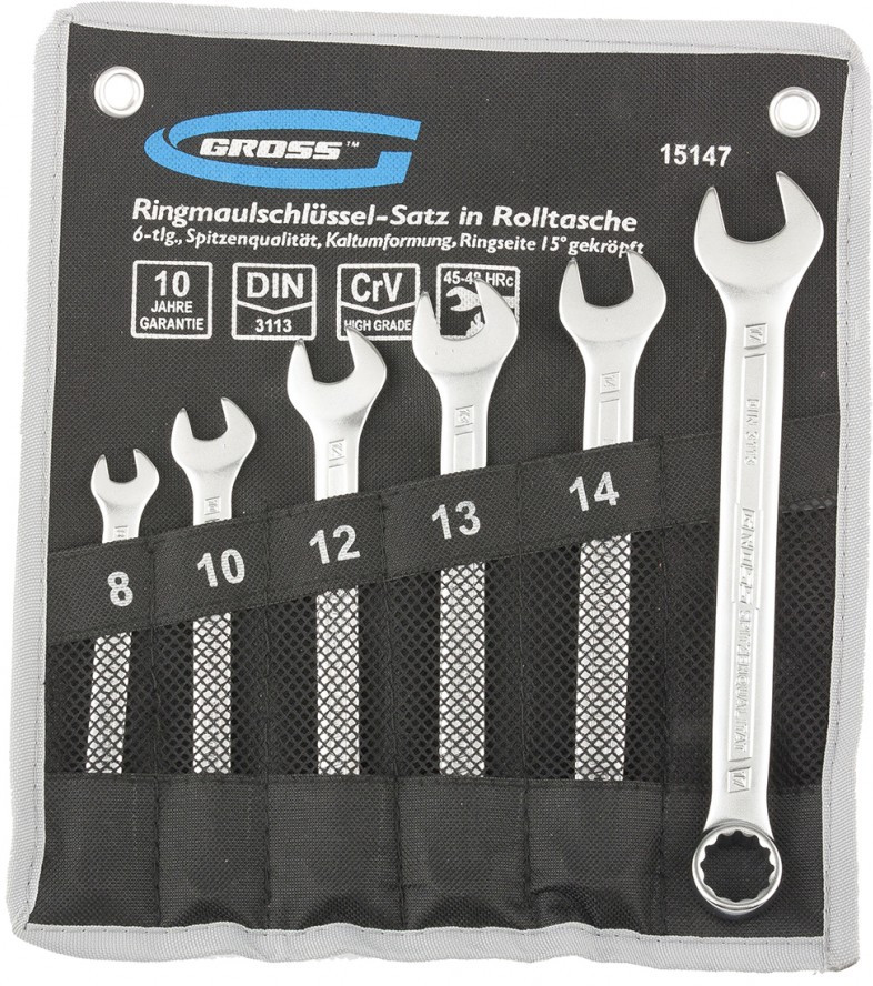 💳 Оплатить за товар можно при получении 🇰🇿 Есть бесплатная доставка по Казахстану от 1 дня 🎁 Копите бонусы с каждой покупки Набор комбинированных ключей торговой марки Gross предназначен для монтажа/демонтажа резьбовых соединений. Ключи набора изготовлены из высококачественной хромованадиевой (Crv) стали методом холодного штампа.Твердость 45-48 HRC. В набор входит шесть ключей размером от 8 до 17 мм. Каждый ключ с одной стороны оснащен захватом открытого типа — рожковым и накидным (кольцевым) с другой стороны. |