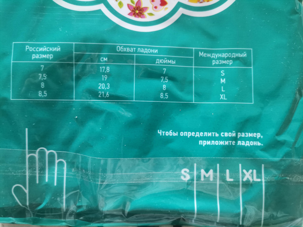 Хорошие перчатки. Второй раз беру. Мою посуды, без агрессивных средств, хватает надолго. На обхат руки 21 хорошо сидит М, в S-ке тесно чуть-чуть, но не критично.