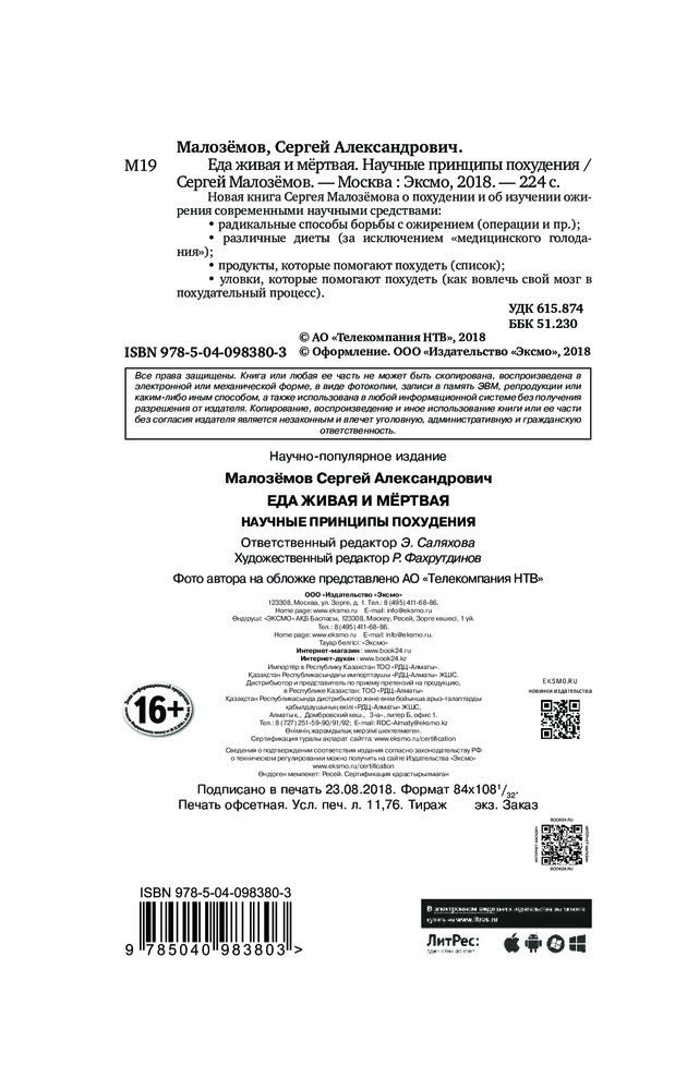 💳 Оплатить за товар можно при получении 🇰🇿 Есть бесплатная доставка по Казахстану 🎁 Копите бонусы с каждой покупки Серия: Еда живая и мёртвая. Книга по мотивам рейтинговой программы на центральном ТВ Новая книга Сергея Малоземова о похудении и об изучении ожирения современными научными средствами: |