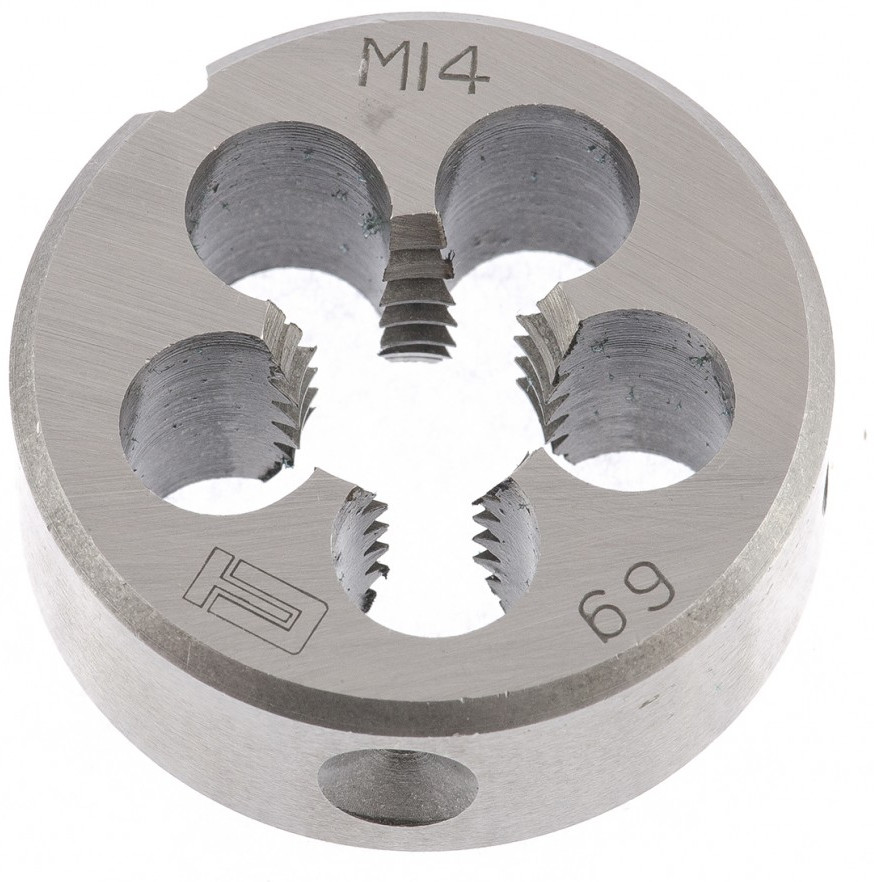 Плашка изготовлена из инструментальной стали. Твердость режущих кромок 60 HRc, что соответствует требованиям ГОСТа (ГОСТ 60–62 HRc). Используется для нарезания внешней резьбы.