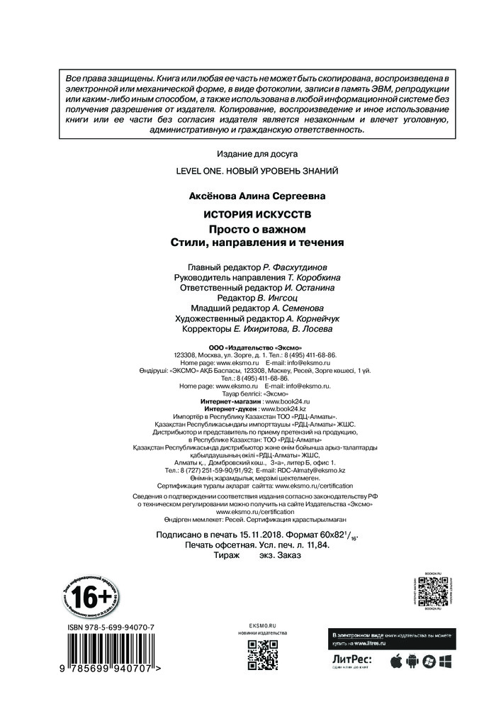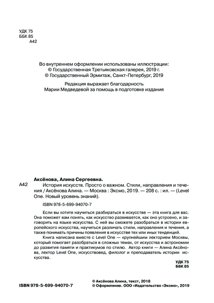 💳 Оплатить за товар можно при получении 🇰🇿 Есть бесплатная доставка по Казахстану от 1 дня 🎁 Копите бонусы с каждой покупки Серия: Level One. Новый уровень знаний Если вы хотите научиться разбираться в искусстве — эта книга для вас. Она поможет вам понять, как искусство развивается, как оно устроено, и заговорить на языке искусства. С ней вы сможете разобраться в истории европейского искусства, научиться различать стили, направления и течения, а также понимать причины появления в искусстве тех или иных явлений.Книга написана вместе с Level One — крупнейшим лекторием Москвы, который помогает разобраться в сложных темах, от искусства и астрономии до развития памяти и практикумов по стилю. Автор книги — Алина Аксенова, лектор Level One, искусствовед, филолог и преподаватель истории искусств. |