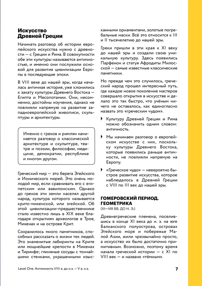 Книга для краткого ознакомления с историей искусства. Для тех, кто хочет в целом увидеть перспективу достижений человечества в культуре или вспомнить основные шедевры.