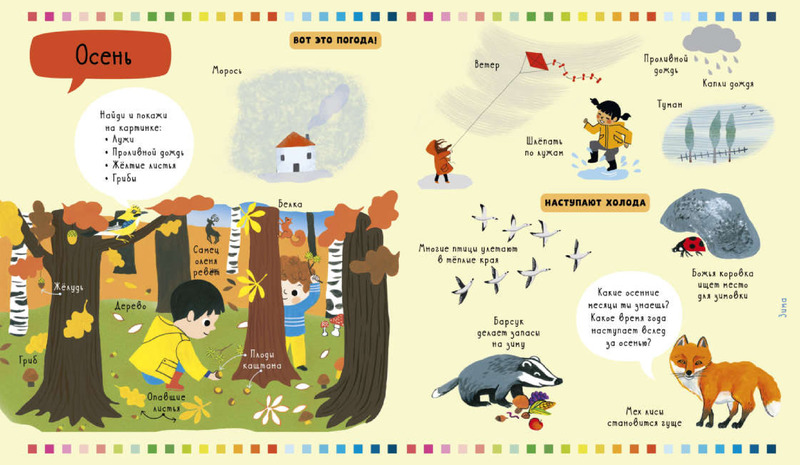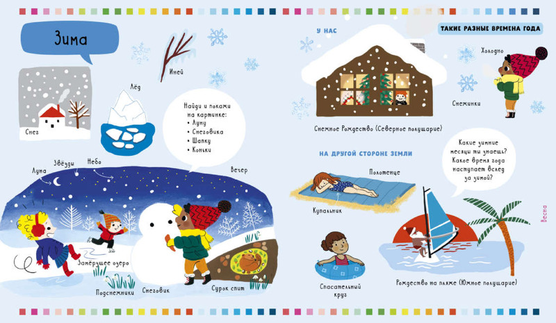 Книга предназначена для детей 1-4 лет (по описанию), при этом совершенно не подходит для обучения малыша временам года. Если вы хотите чтобы ваш ребёнок понял и запомнил времена года - очень советую не использовать эту книгу в силу сумбурного и неструктурированного изложения. Например изучая зиму, вы увидите стандартные снежные картинки и (!!!) картинку отдыха на пляже, с пометкой - на другой стороне земли. Еще бы про амплитуды годовых гармоник и смещение траектории вращения земли написали.