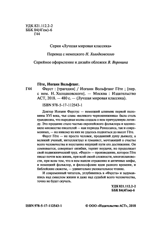 💳 Оплатить за товар можно при получении 🇰🇿 Есть бесплатная доставка по Казахстану 🎁 Копите бонусы с каждой покупки Серия: Лучшая мировая классика Доктор Иоганн Фаустус — немецкий алхимик первой половины XVI века, чья слава «великого чернокнижника» была столь грандиозна, что народная молва создала о нем причудливую легенду. Это предание стало частью европейского фольклора и вдохновило множество писателей — как периода Ренессанса, так и современных, — но никому из них не удалось подняться до высот Гете. Фауст Гете — не просто человек, продавший душу дьяволу, а великий ученый, интеллектуал и гуманист, мечтающий о счастье всего человечества и неустанно ищущий пути его достижения. Он сомневается, совершает ошибки, терпит неудачи, но продолжает свой подвижнический труд. «Фауст» — произведение, которое Гете писал почти всю жизнь, при всей своей сложности, многоплановости, при всем том, что в нем нашли отражение и античные мифы, и немецкий фольклор, и философские идеи разного времени, и библейские сюжеты, — удивительно увлекательное чтение. И современный читатель, углубившись в «Фауста» и задумавшись над смыслом жизни и даже над судьбой всего человечества, точно не будет скучать. |
