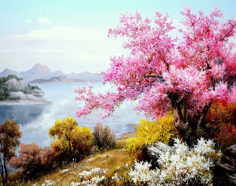 С помощью набора для рисования можно нарисовать картину, на которой запечатлен момент цветения бело-розовой сакуры в горах. На заднем плане возвышаются величественные горы.