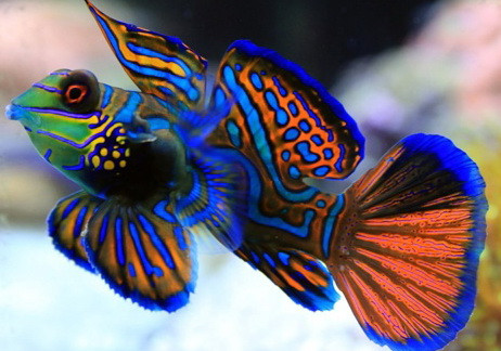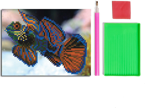 С помощью мозаичных элементов на холсте с уже нанесенным фоном можно выложить изображение радужной рыбки. Сине-зеленый отлив окраса рыбки меняется в зависимости от освещения. Частичная выкладка.