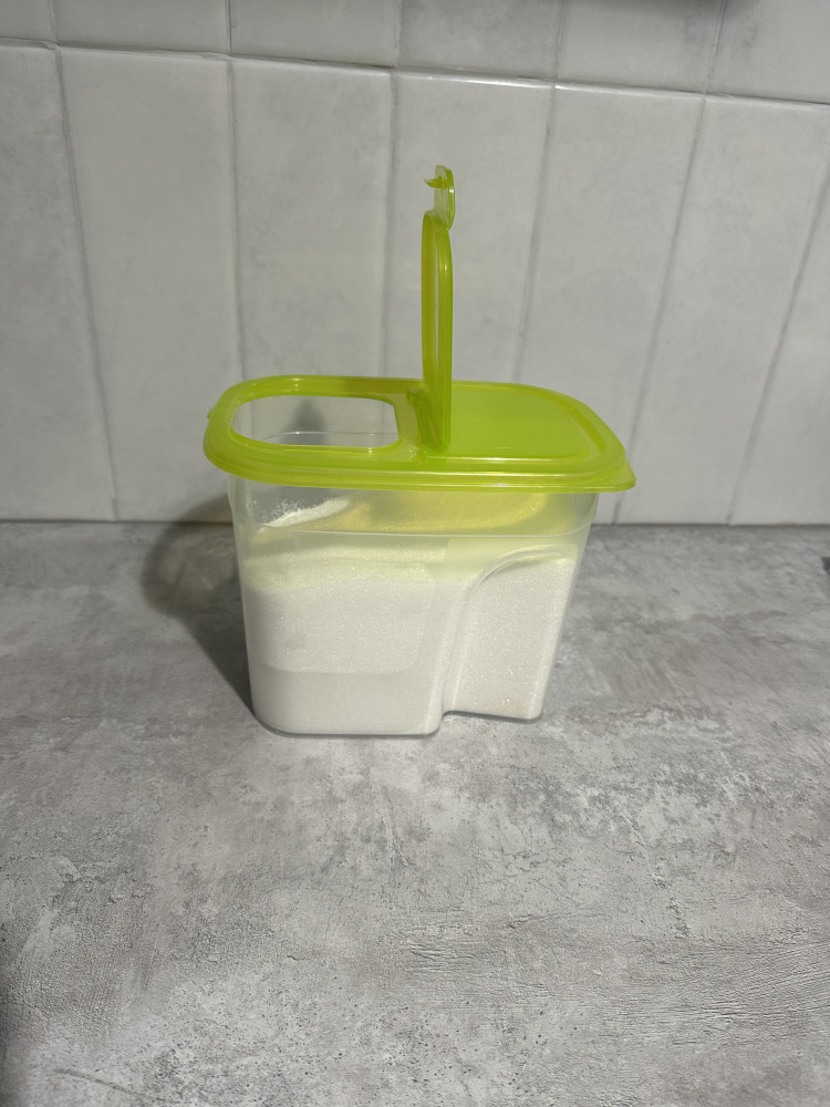 Покупала для хранения сахара.Через отверстие в крышке контейнера удобно насыпать сахар в сахарницу.Покупкой довольна!Спасибо Flip!