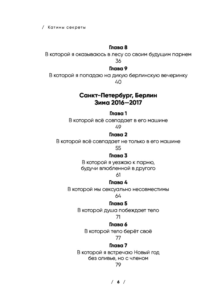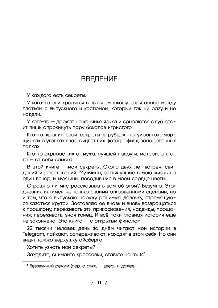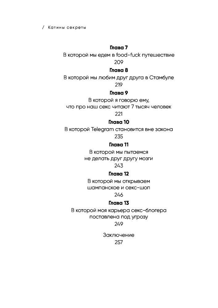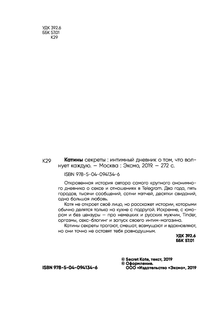 Катины секреты. Интимный дневник о том, что волнует каждуюВ данный момент этот товар отсутствует в продаже. Возможно, у нас найдется аналогичный или похожий товар здесь. Серия: Telegram-book. Откровенно об отношениях Откровенная история автора самого крупного анонимного дневника о сексе и отношениях в Telegram. Два года, пять городов, тысячи сообщений, сотни мэтчей, десятки свиданий, одна большая любовь. Катя не откроет своё лицо, но расскажет истории, которыми обычно делятся только на кухне с подругой. Искренне, с юмором и без цензуры — про немецких и русских мужчин, Tinder, оргазмы, секс-блогинг и запуск своего интим-магазина. Катины секреты трогают, смешат, возмущают и вдохновляют, но они точно не оставят тебя равнодушным. |