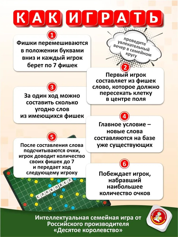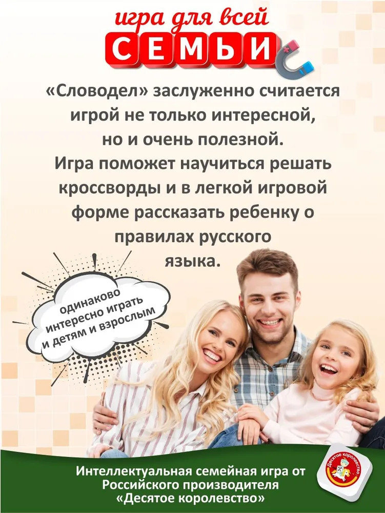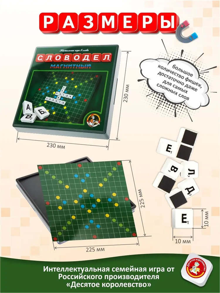 Десятое королевство Игра настольная магнитная «Словодел»замечательная игра детям понравилась словарный запас воображение логика В данный момент этот товар отсутствует в продаже. Возможно, у нас найдется аналогичный или похожий товар здесь. Если вам предстоит долгая дорога, то для того чтобы она не показалась скучной — прихватите с собой настольную игру «Словодел» от бренда «Десятое королевство», чтобы сразиться в интеллектуальном турнире со своими друзьями-попутчиками. Интересная и увлекательная настольная игра позволит членам семьи или дружной компании с пользой и интересом провести время. Комплект представлен металлическим игровым полем на пластиковом основании, разлинованным 15×15 (225 клеток), многочисленными магнитными фишками с буквами и комплектом магнитных вкладышей к фишкам. |