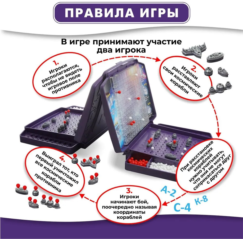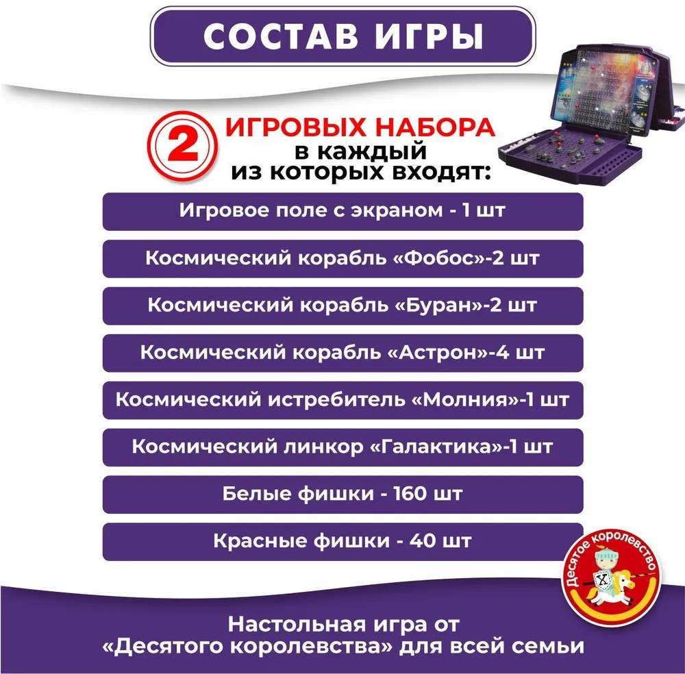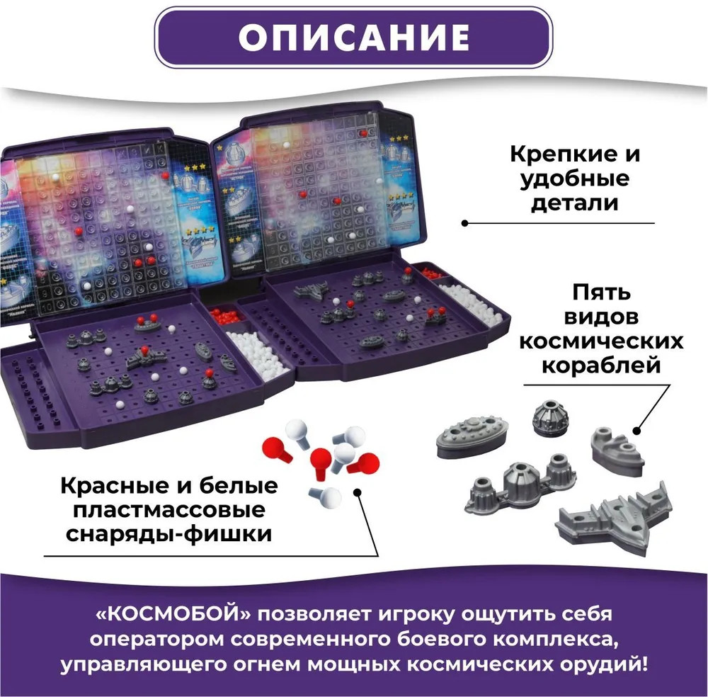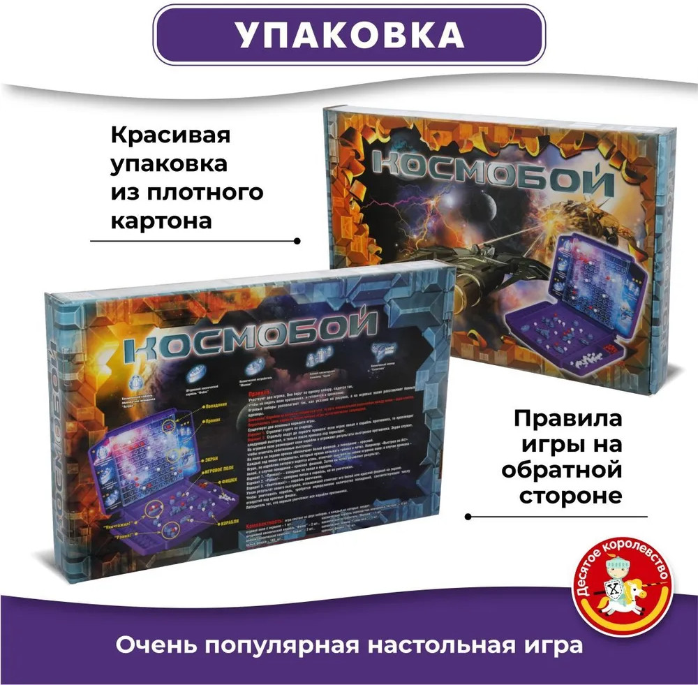💳 Оплатить за товар можно при получении 🇰🇿 Есть бесплатная доставка по Казахстану 🎁 Копите бонусы с каждой покупки Настольная игра для двоих «Космобой» сделана по принципу «Морского боя», только вместо боевых морских кораблей — космические. Правила игры несложные и подробно описаны на оборотной стороне коробки. «Космобой», как и другие аналогичные игры, развивает логику, память и внимание, прививая навыки тактики и стратегии. Игра станет отличным подарком. Желаем удачных боев на полях игры! |