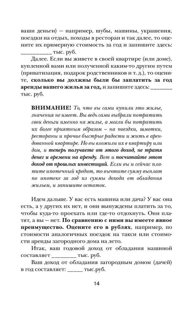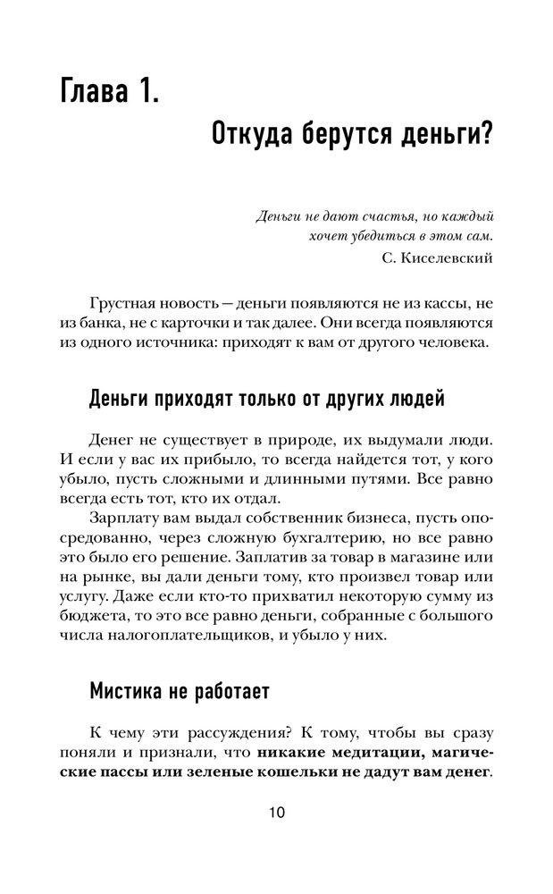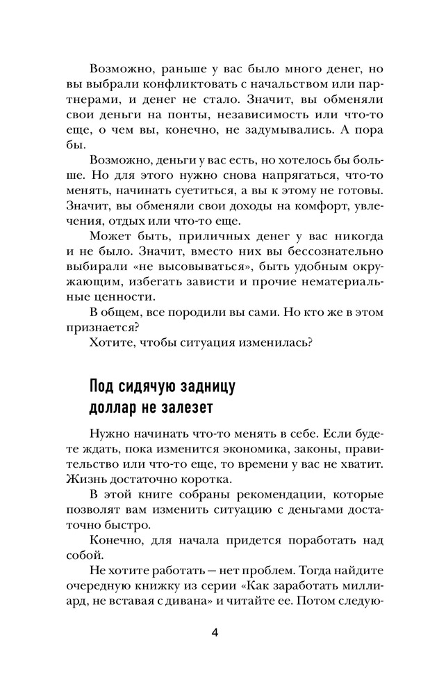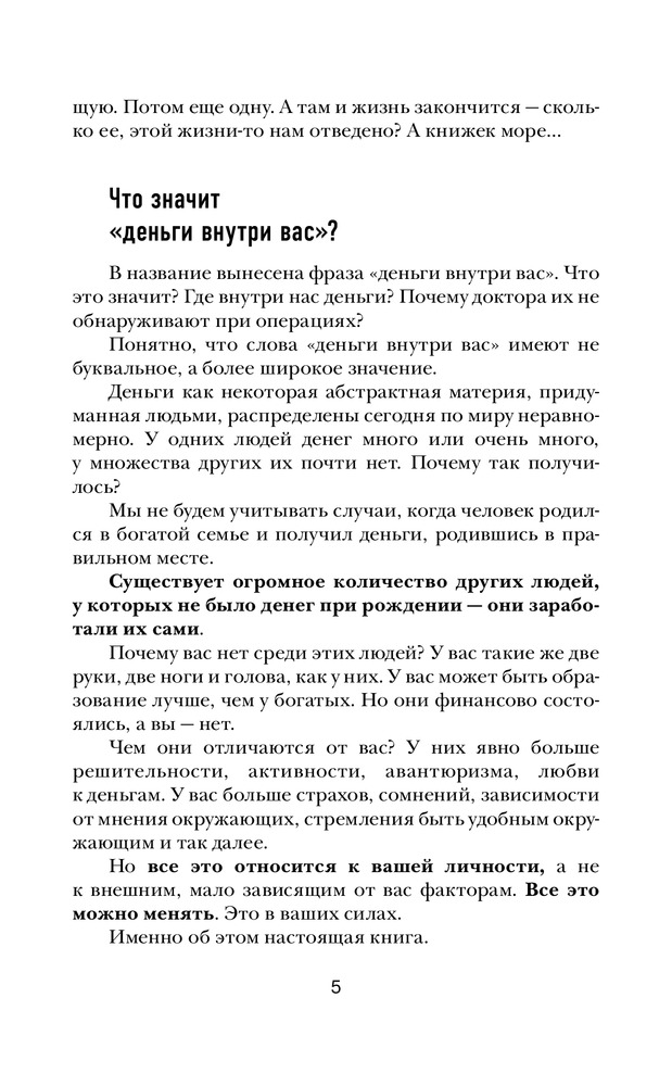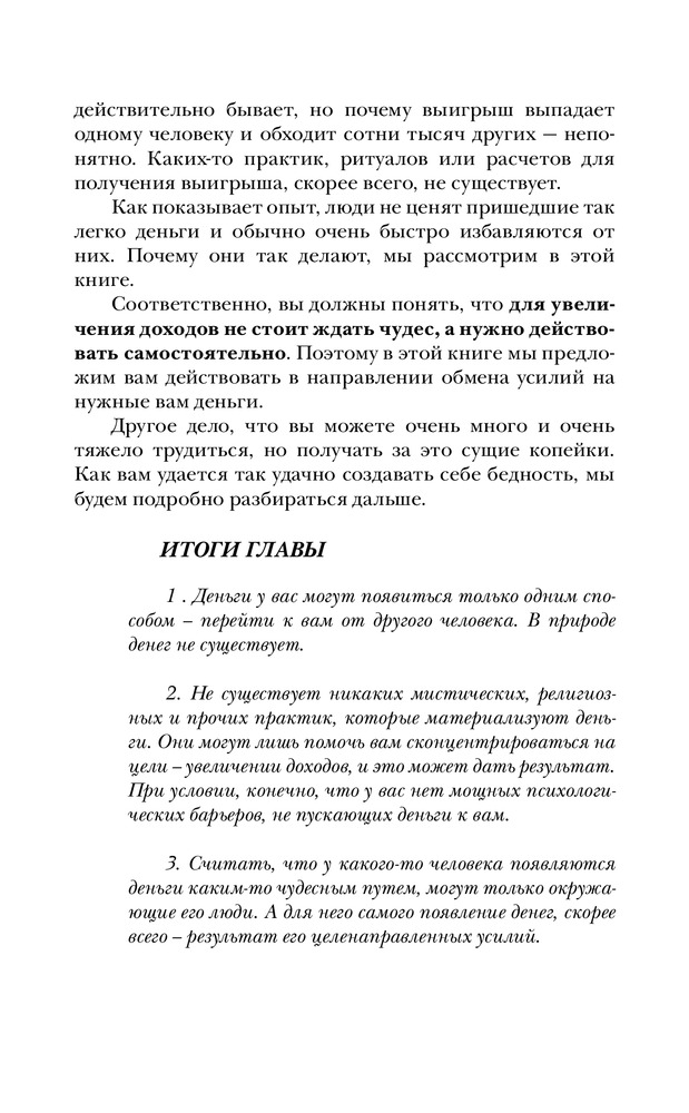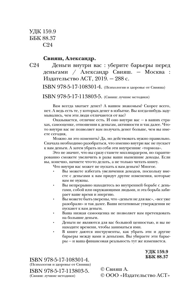 Деньги внутри вас. Уберите барьеры перед деньгамиВ данный момент этот товар отсутствует в продаже. Возможно, у нас найдется аналогичный или похожий товар здесь. Серия: Свияш: лучшие методики Вам всегда хватает денег? А вашим знакомым? Скорее всего, нет. А ведь есть те, у которых денег в избытке. Вы когда-нибудь задумывались, чем эти люди отличаются от вас? Оказывается, отличие есть. И оно внутри вас — в ваших страхах, самооценке, отношении к деньгам, активности и так далее. Что-то внутри вас не позволяет вам получать денег больше, чем вы имеете сегодня, Можно ли это изменить? Да, но действовать нужно правильно. Сначала необходимо разобраться, что именно внутри вас не пускает к вам деньги. А затем убрать из себя эти внутренние «тормоза». Это не значит, что вы сразу станете миллиардером, но гарантированно сможете увеличить в разы ваши нынешние доходы. Если вы, конечно, начнете что-то делать, а не только читать книгу. |