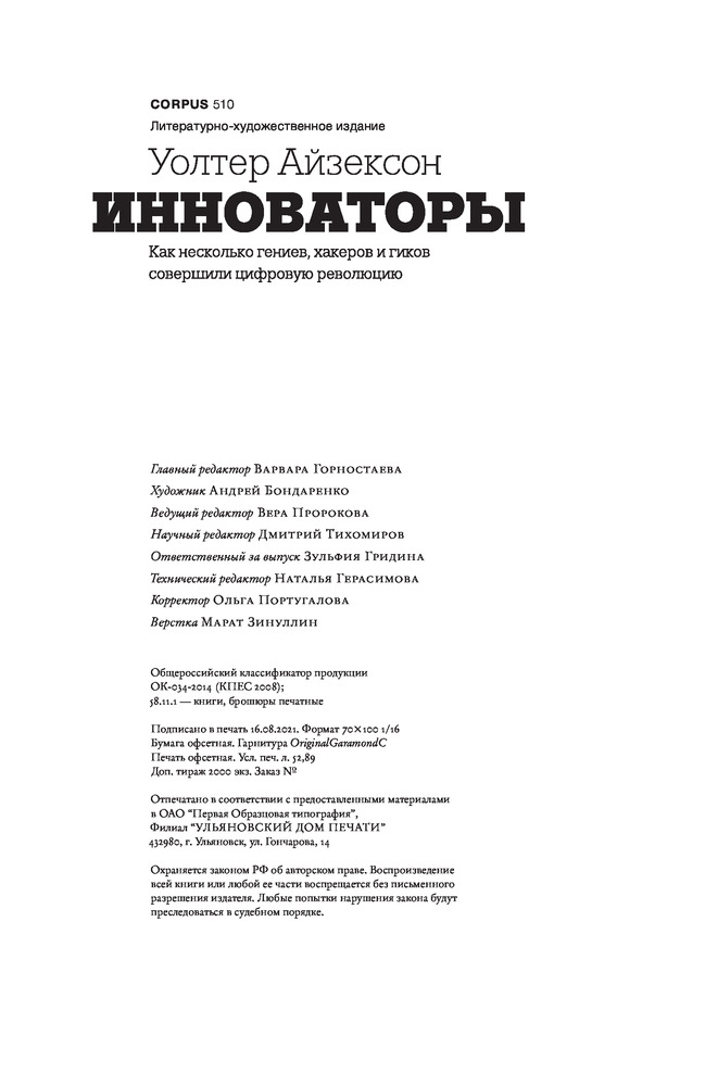 ИнноваторыВ данный момент этот товар отсутствует в продаже. Возможно, у нас найдется аналогичный или похожий товар здесь. После ставшей мировым бестселлером биографии Стива Джобса Айзексон написал о людях, благодаря которым появились компьютеры и интернет. Это история о разных этапах цифровой революции, о том, как добиваться того, чтобы мечты претворялись в жизнь. Начинается она с сороковых годов XIX века, с Ады Лавлейс, первой нащупавшей принципы компьютерного программирования. А дальше следует рассказ о тех, без кого не было бы ни компьютеров, ни интернета, — о Вэниваре Буше, Алане Тьюринге, Билле Гейтсе, Стиве Возняке, СтивеДжобсе и Ларри Пейдже. |