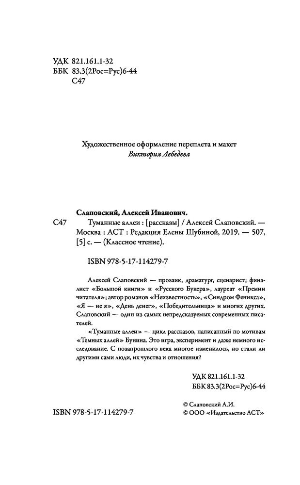 💳 Оплатить за товар можно при получении 🇰🇿 Есть бесплатная доставка по Казахстану 🎁 Копите бонусы с каждой покупки Серия: Классное чтение Алексей Слаповский — прозаик, драматург, сценарист; финалист «Большой книги» и «Русского Букера», лауреат «Премии читателя». Автор романов «Неизвестность», «Синдром Феникса», «Я — не я», «День денег», «Победительница» и многих других. Слаповский — один из самых непредсказуемых современных писателей. «Туманные аллеи» — цикл рассказов, написанный по мотивам «Темных аллей» Бунина. Это игра, эксперимент и даже немного исследование. С позапрошлого века многое изменилось, но стали ли другими сами люди, их чувства и отношения? «Меня всегда манили и раздражали „Темные аллеи“ Бунина. Манили тем, как написано, а раздражали многим. И архаичным до неловкости эротизмом. И книжностью разговорного языка. И отношением к женщине как объекту, пусть даже и поклонения. А однажды подумалось: ведь я знаю все то, о чем рассказал Бунин. Такие или подобные истории случались со мной, с моими друзьями и знакомыми. Мне захотелось понять, что изменилось, как живут сейчас эти сюжеты. Сравнить два времени. Уловить перемены в людях, в языке, в том, что мы называем любовью, понимая под этим каждый свое». |