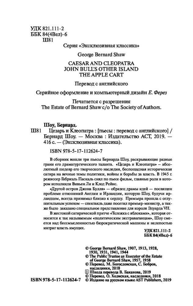 💳 Оплатить за товар можно при получении 🇰🇿 Есть бесплатная доставка по Казахстану от 1 дня 🎁 Копите бонусы с каждой покупки Серия: Эксклюзивная классика В сборник вошли три пьесы Бернарда Шоу, раскрывающие разные грани его драматургического таланта. «Цезарь и Клеопатра» — абсолютный шедевр его творческого наследия, беспощадная историческая сатира на вечные темы политики, войны и борьбы за власть. В 1945 г. режиссер Габриэль Паскаль снял по пьесе фильм, главные роли в котором исполнили Вивьен Ли и Клод Рейнс. «Другой остров Джона Булля» — образец драмы идей — посвящен проблеме отношений Англии и Ирландии, которую Шоу, будучи ирландцем, всегда принимал близко к сердцу. Премьера прошла с оглушительным успехом — спектакль даже посетил премьер-министр, а также было заказано специальное представление для короля Эдуарда VII. В жестокой сатирической притче «Тележка с яблоками», которая относится к так называемым «политическим экстраваганцам», Шоу смеется над бессмысленностью бюрократической машины и нелепостью интриг власть имущих. |