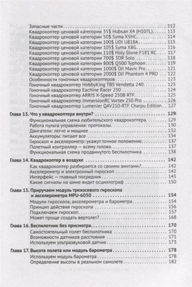 Беспилотники для любознательныхВ данный момент этот товар отсутствует в продаже. Возможно, у нас найдется аналогичный или похожий товар здесь. Книга поможет освоить управление беспилотными самолетами, вертолетами и мультикоптерами, ставшими особенно популярными в XXI веке. Сбылась мечта осуществлять виртуальный полет, видеть свой город сверху, снимать видео с большой высоты, наслаждаться воочию необычной панорамой, благодаря такому чудесному изобретению, как квадрокоптер. Для освоения навыков пилотирования в начале книги в ходе диалога рассматриваются основы устройства, работы и управления настоящими летательными аппаратами, такими как самолеты и вертолеты. Понимание этих основ поможет научиться управлять беспилотниками различных типов. Рассматриваются характеристики наиболее популярных моделей квадрокоптеров. Даются полезные советы по их безопасной эксплуатации в различных погодных условиях. Большое внимание уделено электронной начинке квадрокоптера для тех, кого больше интересует самостоятельное изготовление, настройка и ремонт. Каждый из компонентов квадрокоптера (или беспилотника) можно исследовать и настраивать с помощью общепринятых сегодня радиолюбительских инструментов. Рассмотрен и модуль Arduino, который может стать будущим полетным контроллером. Книга предназначена для широкого круга любознательных читателей, увлеченных авиацией, беспилотными полетами, электроникой, микроконтроллерами и техническим творчеством. |