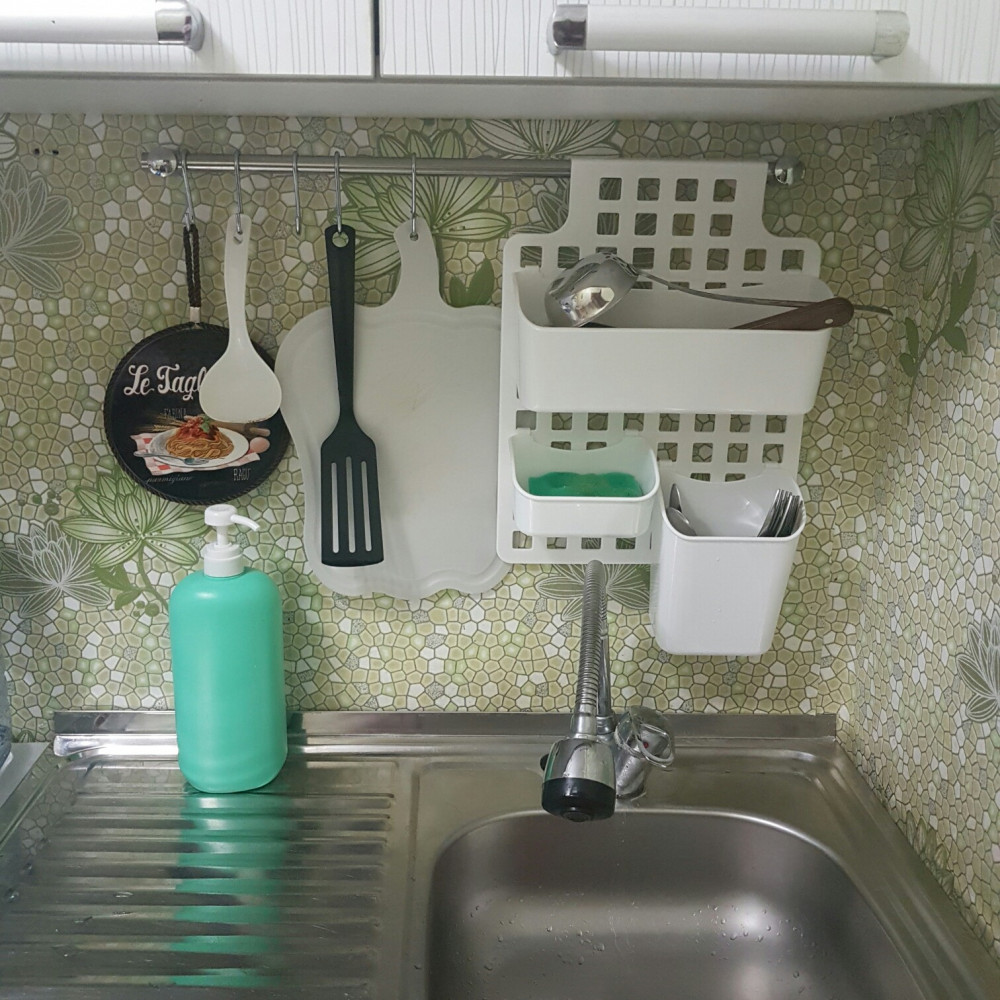 Органайзер нашел свое место на дверце шкафа под мойкой. Теперь средство для мытья посуды, тряпочки и щетки разместились в нем, и не лежат на столе тем самым создавая порядок.