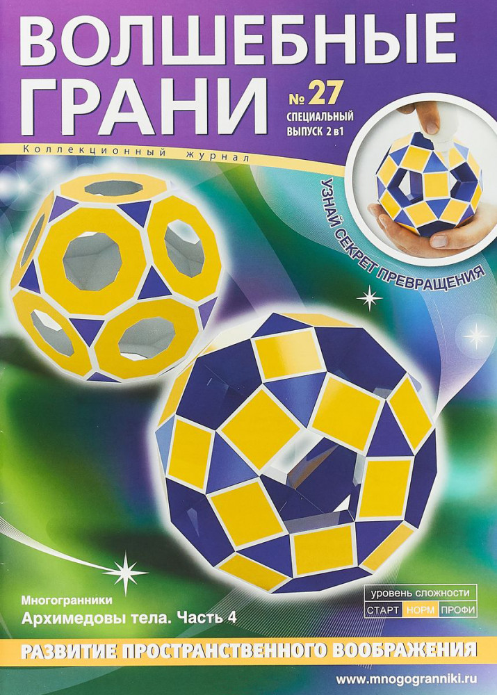 Волшебные грани № 27. Архимедовы тела. Часть 4В данный момент этот товар отсутствует в продаже. Возможно, у нас найдется аналогичный или похожий товар здесь. Серия: Волшебные грани «Волшебные грани» — журнал для взрослых и детей о моделях бумажных многогранников. Создание моделей многогранников из картона очень увлекательное и доступное занятие, это «магия превращения» листа бумаги в объемную фигуру. Самые простые модели многогранников могут быть собраны из одной детали. Более интересные и красивые фигуры Вы можете собрать из немецкого картона высочайшего качества входящего в данный набор. Инструкция и комплект деталей выполнен таким образом, что сборка многогранника удобна и понятна. |