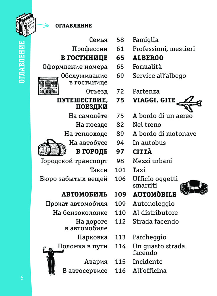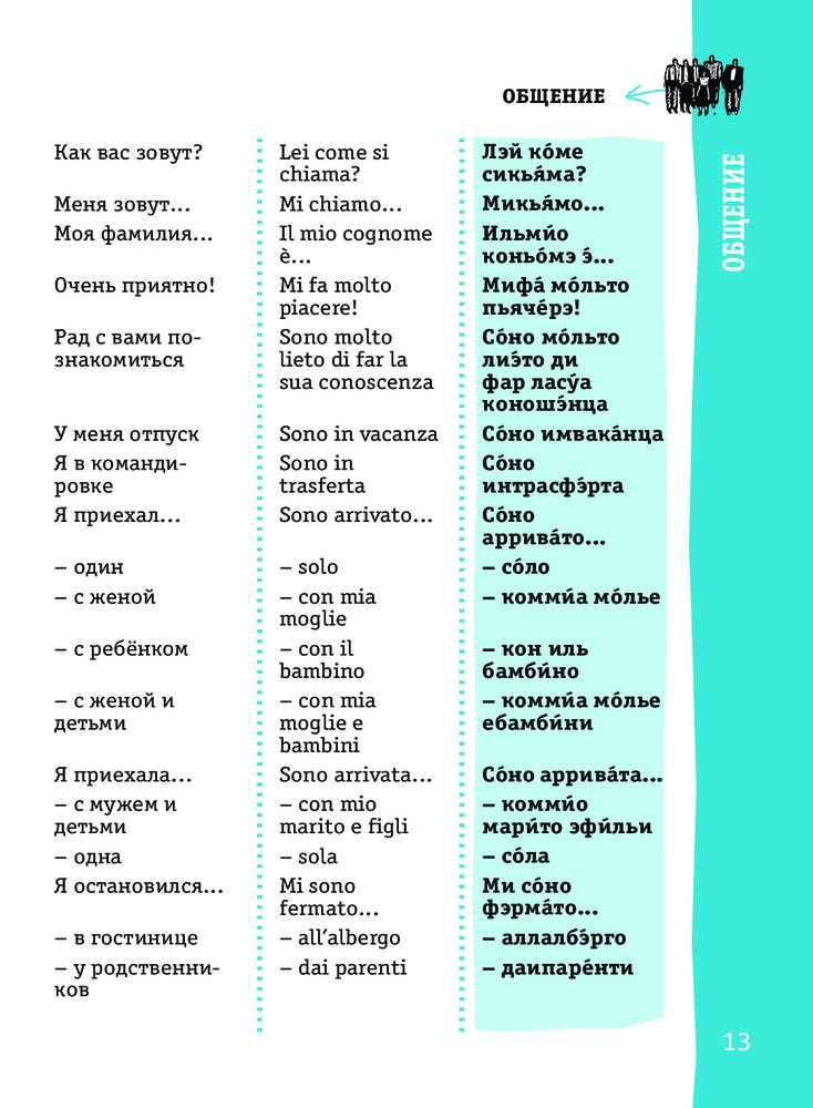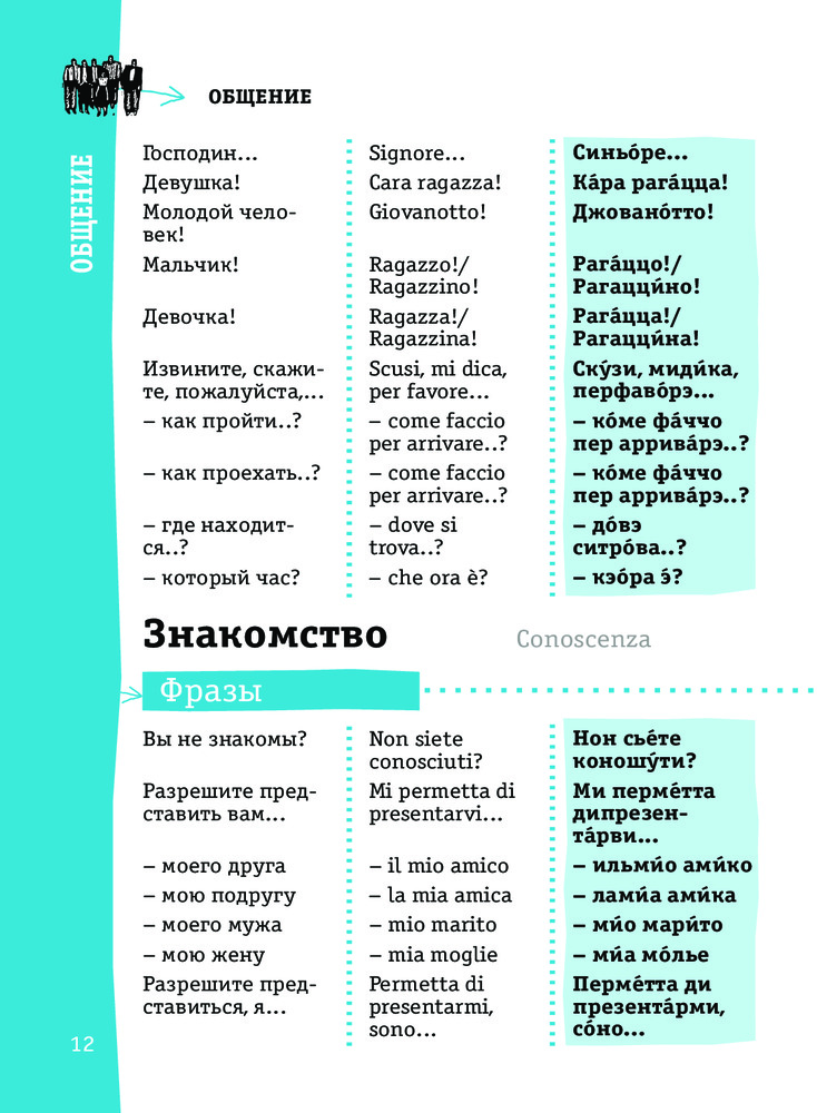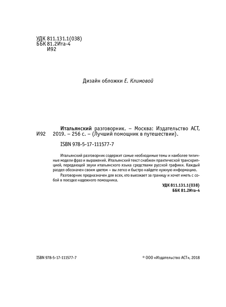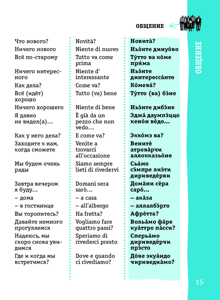 Итальянский разговорникВ данный момент этот товар отсутствует в продаже. Возможно, у нас найдется аналогичный или похожий товар здесь. Серия: Лучший помощник в путешествии Итальянский разговорник содержит самые необходимые темы и наиболее типичные модели фраз и выражений. Итальянский текст снабжен практической транскрипцией, передающей звуки итальянского языка средствами русской графики. Каждый раздел обозначен своим цветом — вы легко и быстро найдете нужную информацию. Разговорник предназначен для всех, кто выезжает за границу и хочет иметь с собой в поездке надежного помощника. |