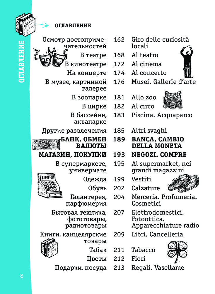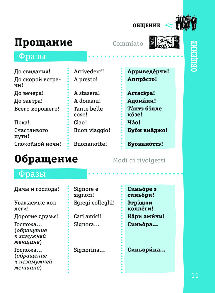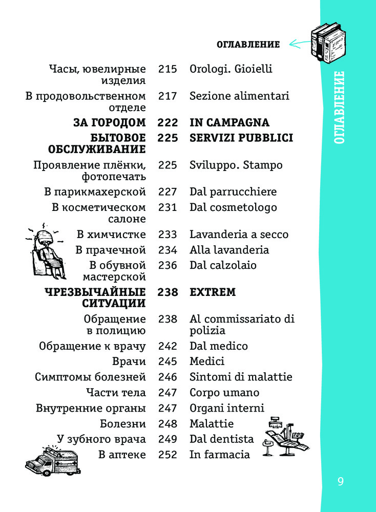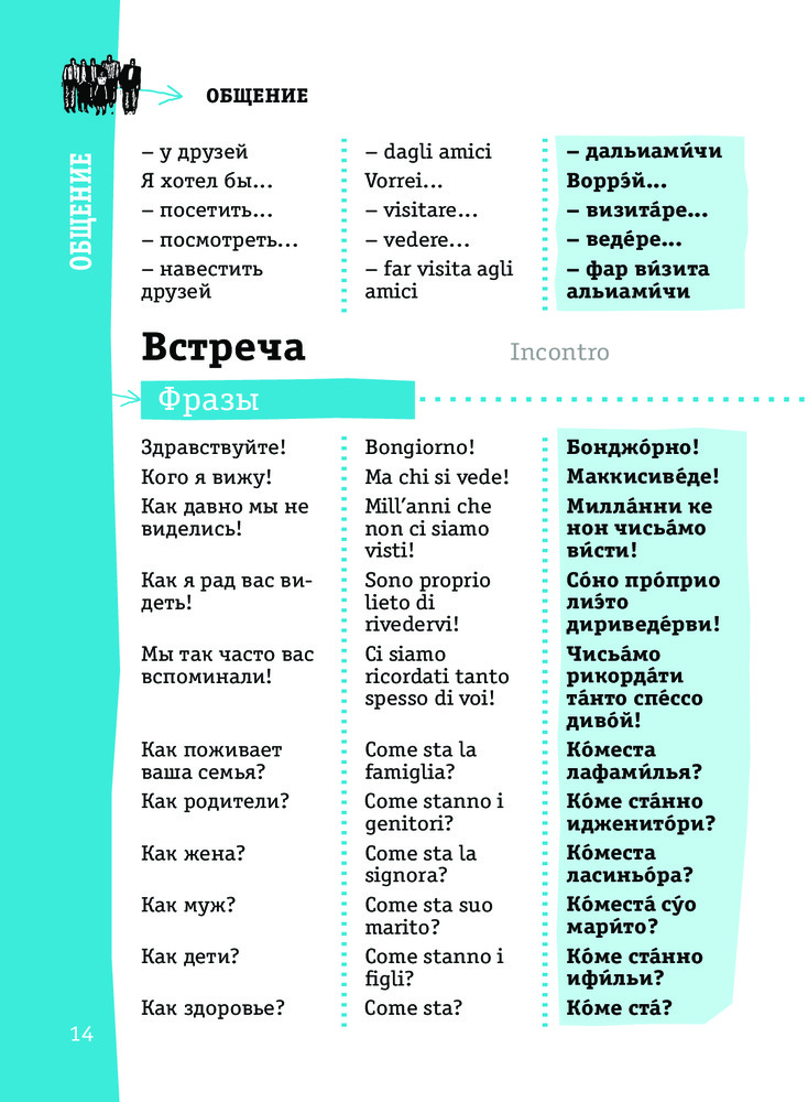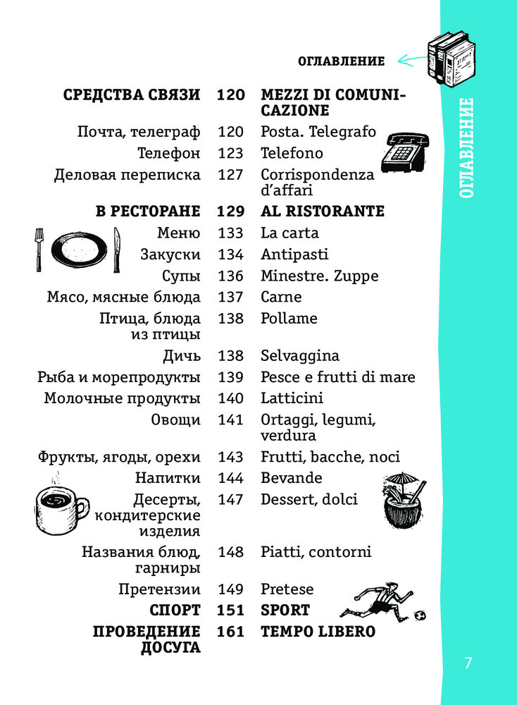 Итальянский разговорникВ данный момент этот товар отсутствует в продаже. Возможно, у нас найдется аналогичный или похожий товар здесь. Серия: Лучший помощник в путешествии Итальянский разговорник содержит самые необходимые темы и наиболее типичные модели фраз и выражений. Итальянский текст снабжен практической транскрипцией, передающей звуки итальянского языка средствами русской графики. Каждый раздел обозначен своим цветом — вы легко и быстро найдете нужную информацию. Разговорник предназначен для всех, кто выезжает за границу и хочет иметь с собой в поездке надежного помощника. |