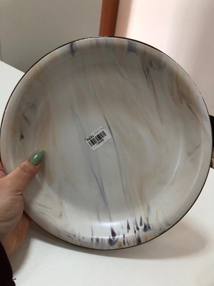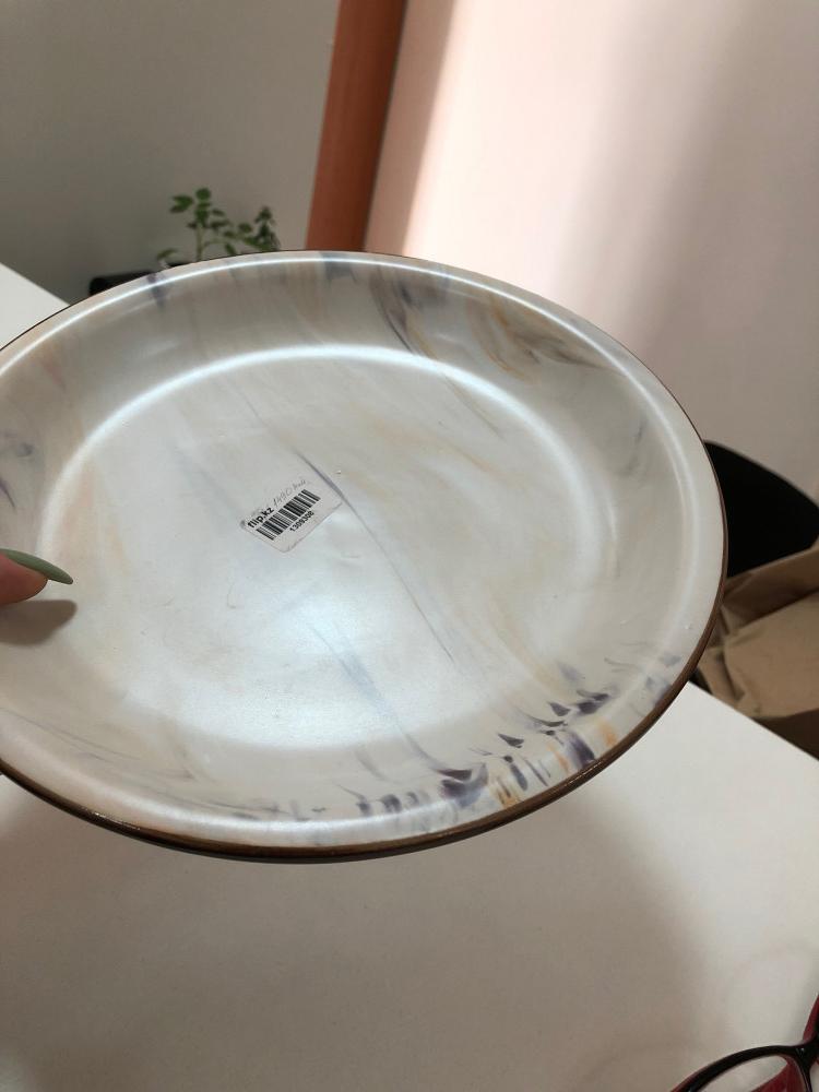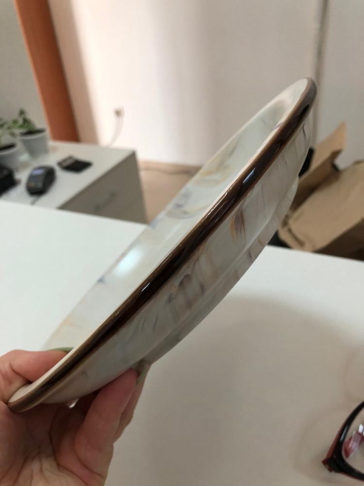 Тарелка добротная; плоская по центру с бортиками. Она не выглядит порционной, скорее для подачи блюд (это, кстати, сказано в описании). НО!! Она выглядит на фото как тончайшая и невесомая - это не так. Она прям тяжелая! По весу как глиняная. Очень толстостенная (см.фото). Описываю так подробно, чтобы вы сразу понимали что заказываете. Тарелка очень милая, но мне совершенно не подошла по стилю (за это и сняла звезду)