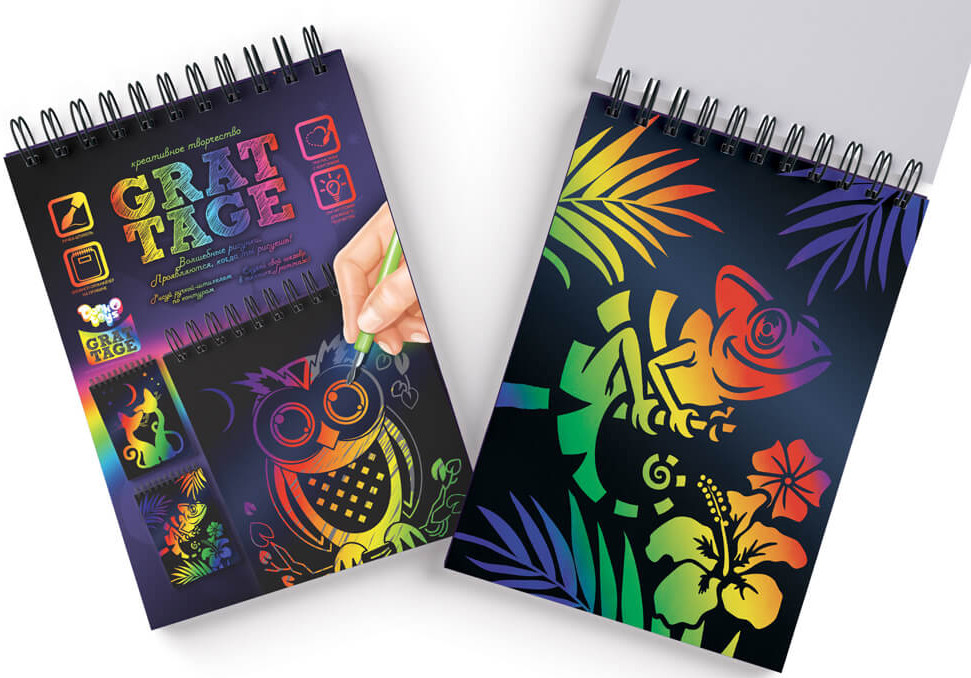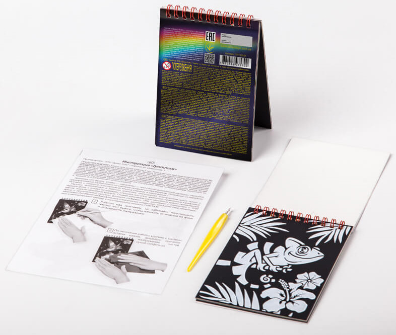 Оказывается это не блокнот с бумажными страницами, с корочками, которые можно украсить, а просто темные картонки на пружинке, часть с картинками которые можно выскребать, часть пустые для самост рисунков. Но получилось очень красиво, дети рады.