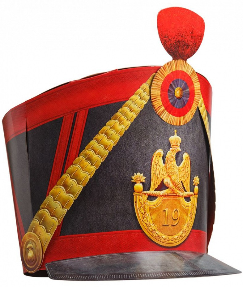 Кивер был распространённым головным убором военнослужащих многих европейских армий начала XIX века. Высокий, тяжелый и не очень удобный головной убор защищал головы солдат от сабельного удара. Компания «Умная бумага» предлагает серию головных уборов из картона. Собрав колпак кивера, можно участвовать в фотосессии или отправиться на бал-маскарад. Он позволит выделиться и почувствовать себя настоящим героем. В его производстве использован картон толщиной 0,2-0,5 мм. Здесь используется собственная уникальная технология сборки военного цилиндра без ножниц и клея. Процесс достаточно простой и увлекательный. Можно собрать целую коллекцию картонных игрушек, которые украсят детскую и доставят много радости детям и родителям.