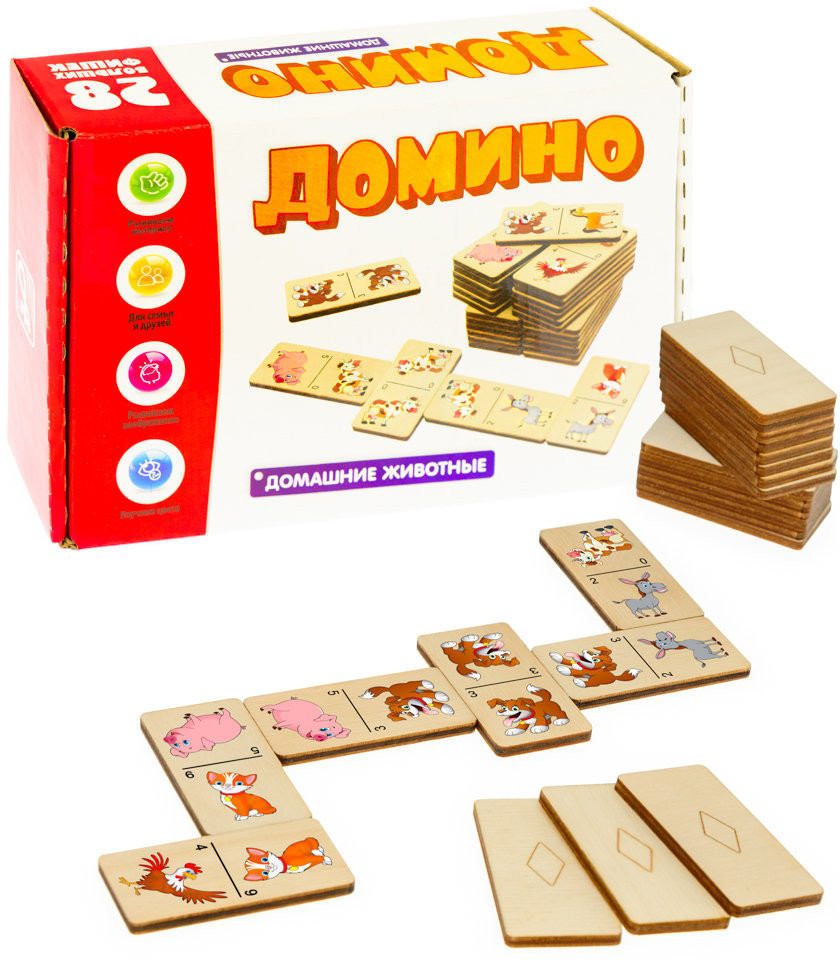Игра большое домино для детей — отличная развивающая игрушка из экологичного материала — российской березовой фанеры. Фишки большого размера — 30×60 мм — прекрасно подойдут даже для самых маленьких игроков. Малышу удобно держать такую фишку. Рисунки на ней — яркие и большие. С этой игрушкой можно играть не только дома, но и эффективно использовать для занятий в детском саду. Играя, ребенок развивает целый спектр навыков: моторику, логику, воображение, а также изучает окружающий мир, счёт, арифметику и цвета.