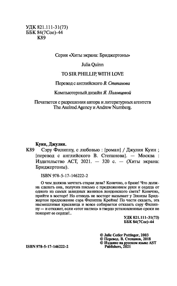 💳 Оплатить за товар можно при получении 🇰🇿 Есть бесплатная доставка по Казахстану от 1 дня 🎁 Копите бонусы с каждой покупки Серия: Хиты экрана: Бриджертоны О чем должна мечтать старая дева? Конечно, о браке! Что должна сделать она, получив письмо с предложением руки и сердца от одного из самых завидных женихов лондонского света? Конечно, прийти в восторг. Но отнюдь не восторг вызывает у Элоизы Бриджертон предложение сэра Филиппа Крейна! По чести сказать, эта насмешливая красавица и вовсе собирается отказать сэру Филиппу — и откажет, если «этот наглец» в твердо установленные сроки не покорит ее сердце!.. |
