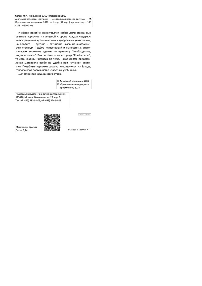Учебное пособие представляет собой ламинированные цветные карточки, на лицевой стороне каждая содержит иллюстрацию из курса анатомии с цифровыми указателями, на обороте — русские и латинские названия анатомических структур. Подбор иллюстраций и вынесенных анатомических терминов сделан по принципу «необходимое, но достаточное». Это пособие — своего рода «Crash course», то есть краткий интенсив по теме. Такая форма представления материала особенно удобна при изучении анатомии. Подобные карточки широко используются на Западе, сопровождая большинство известных учебников. Для студентов медицинских вузов. |