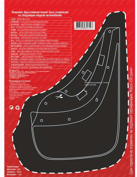 Брызговики неплохие, но пришли без саморезов. Хотя на упаковке написано, что в комплекте 10 саморезов