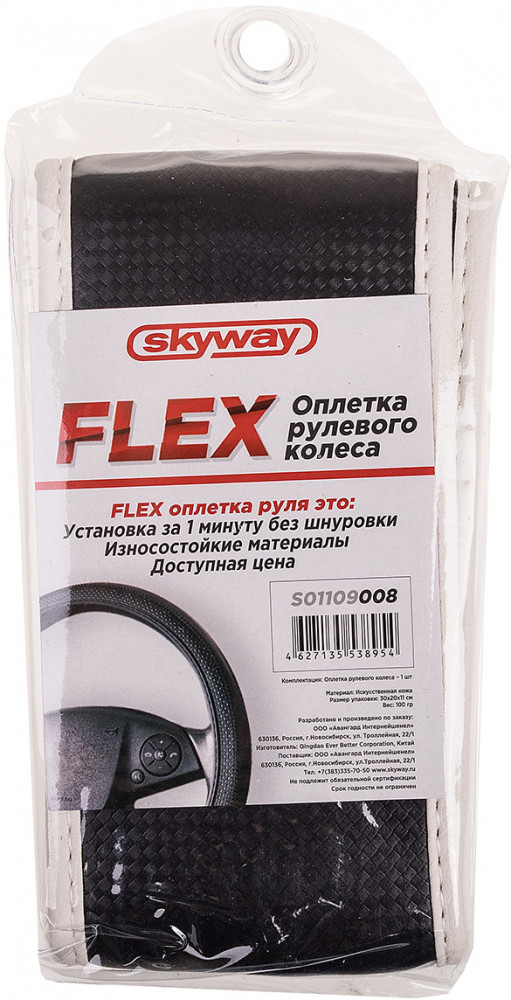 Оплетка Skyway Flex-7 обеспечивают надёжный контакт ладоней с ободом рулевого колеса. Удобная установка за 1 минуту без шнуровки. Оплетка выполнена из высококачественной экокожи, которая сохраняет привлекательный внешний вид в течение длительного времени. Она не раскаляется при воздействии солнечных лучей, а в зимнее время не холодная на ощупь. Применение инновационных материалов на внутренней стороне оплетки исключает ее проскальзывание на руле.