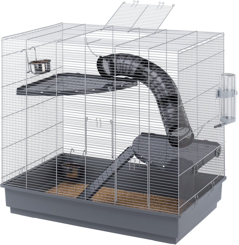 Клетка для крыс Jenny — вертикальная клетка для крыс с необходимым для них пространством. Вашему питомцу понравится исследовать все уровни клетки, состоящие из пластиковых полок, соединенных туннелями. Клетка оборудована и другими аксессуарами, такими, как поилка, пластиковая лесенка и миски из стали, прочные, гигиеничные и оборудованные крючками. Поддон легко отсоединяется от металлической решетки, что очень удобно при уборке.