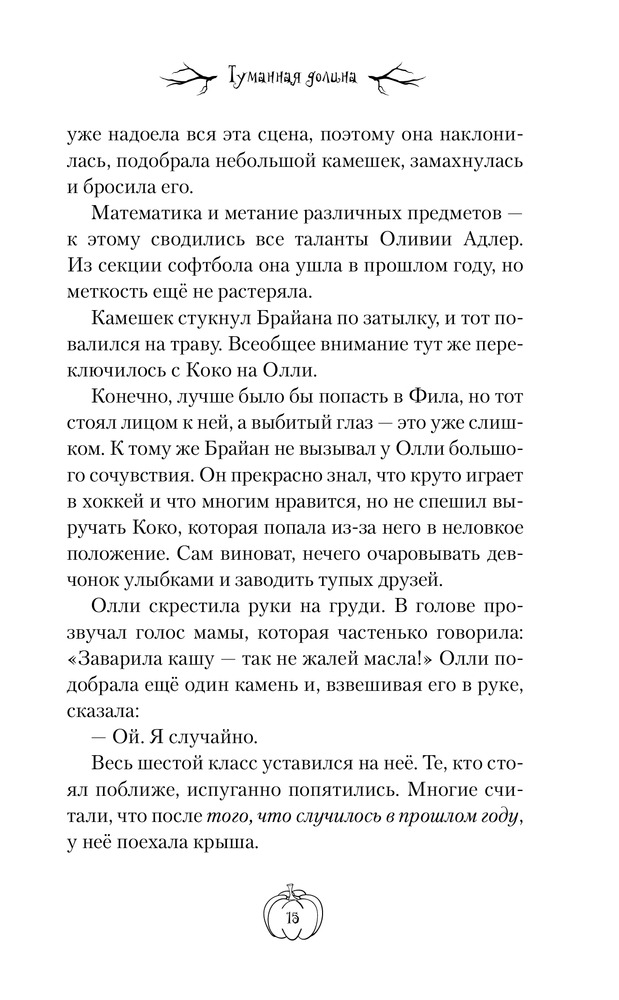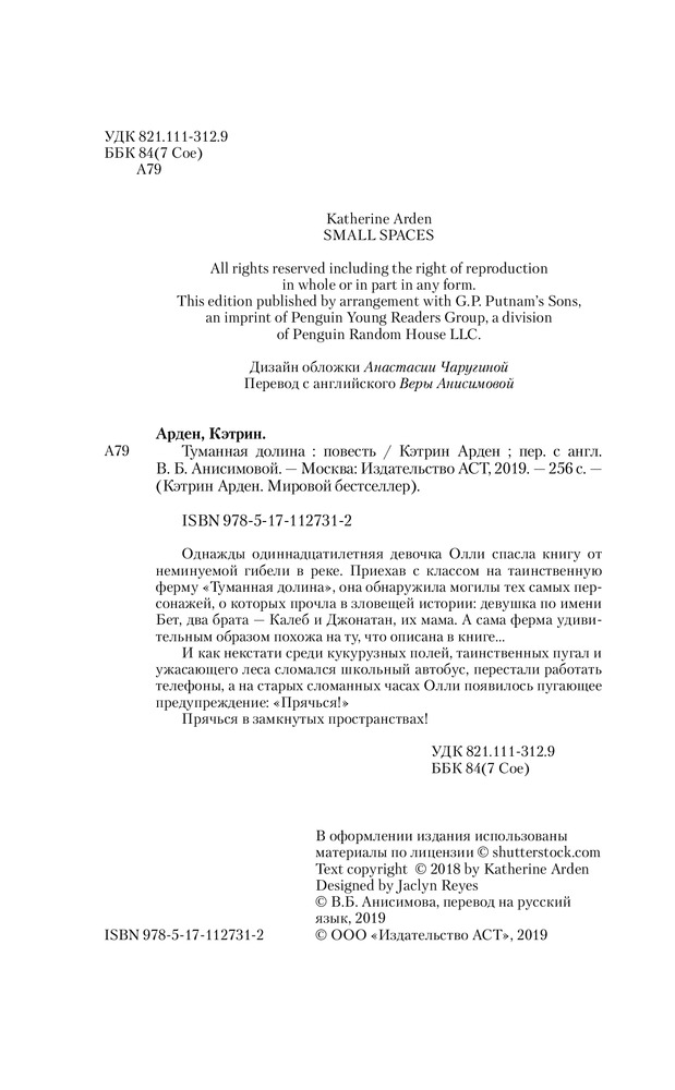 Туманная долинаВ данный момент этот товар отсутствует в продаже. Возможно, у нас найдется аналогичный или похожий товар здесь. Серия: Там, где живут призраки Однажды одиннадцатилетняя девочка Олли спасла старую книгу от неминуемой гибели в реке. Приехав с классом на таинственную ферму «Туманная долина», она обнаружила могилы тех самых персонажей, о которых прочла в зловещей истории: девушка по имени Бет, два брата — Калеб и Джонатан, их мама. А сама ферма удивительным образом похожа на ту, что описана в книге... И как некстати среди кукурузных полей, таинственных пугал и ужасающего леса сломался школьный автобус, перестали работать телефоны, а на старых сломанных часах Олли появилось пугающее предупреждение: «Прячься!» Прячься в замкнутых пространствах! |