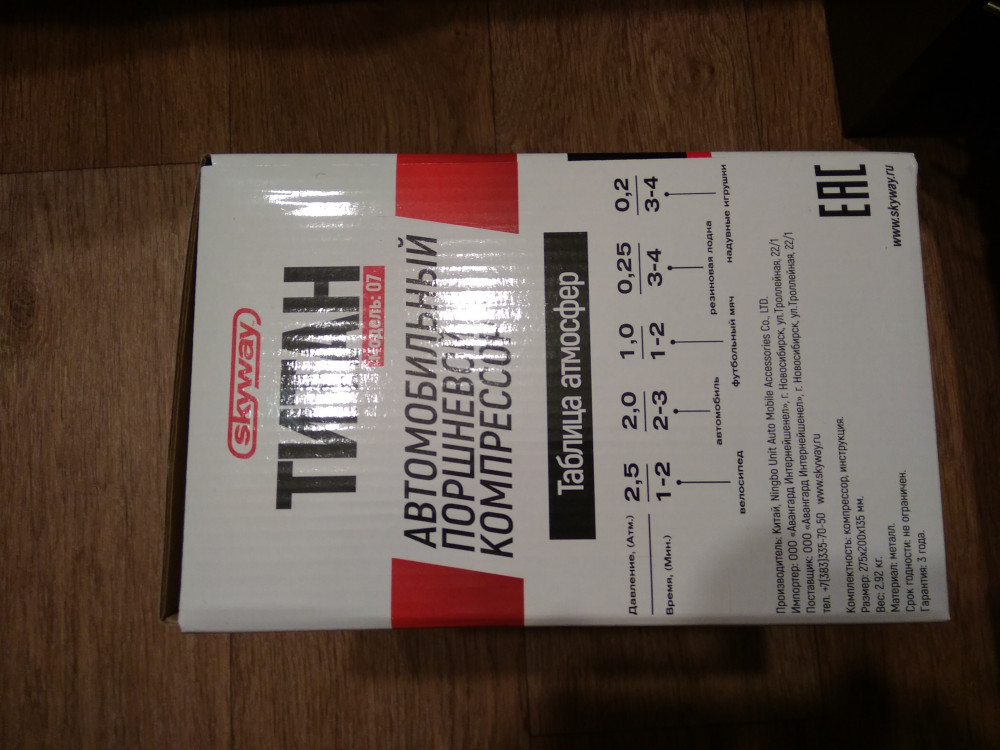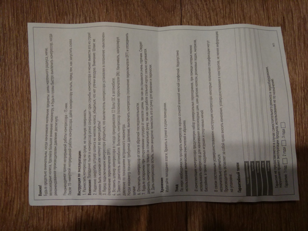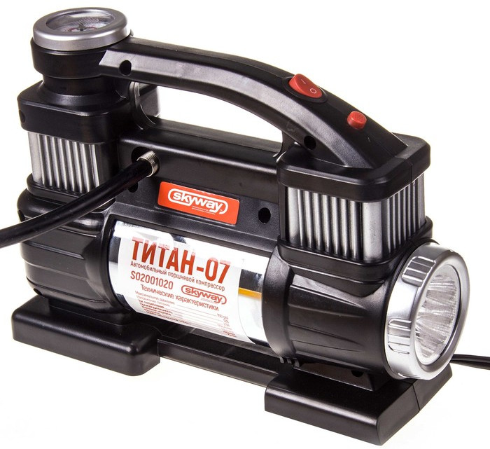 Корпус металлический с удобной ручкой для переноски. Компрессор оснащен манометром и фонариком, который помогает при работе в плохо освещенном месте. В комплекте 3 насадки для накачивания резиновых мячей, игрушек и лодок. Тканевая сумка на молнии обеспечивает удобное хранение и транспортировку.