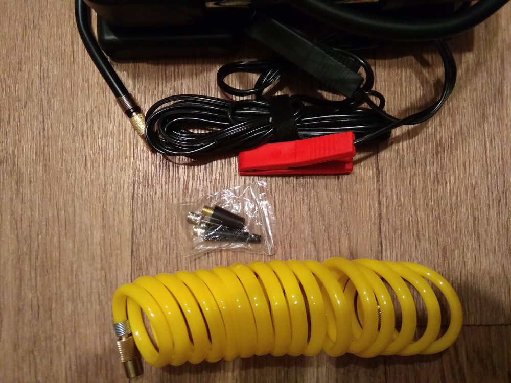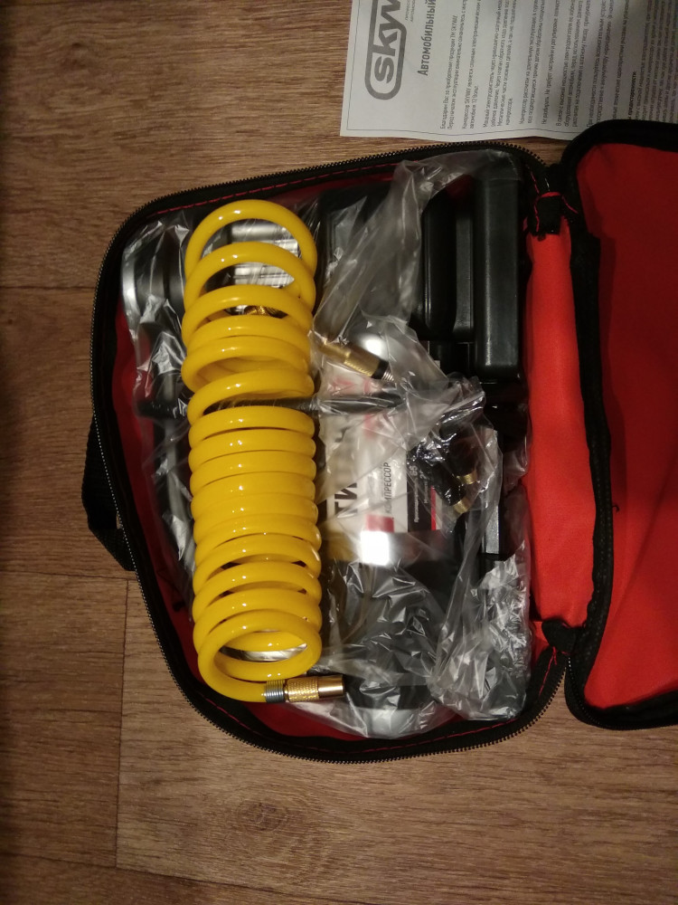 Как и ожидалось, шланг жёсткий, полностью не растягивается. до дальнего колеса можно дотянуться если только через салон. Или необходимо удлинить питающий кабель. Работает хорошо. R16 206/65 за 3-4 мин. до 1.8 атм. накачал. Молния на сумке закрывается в натяг, быстро разойдется. Кейс был бы лучше, но занимал бы больше места и дороже.