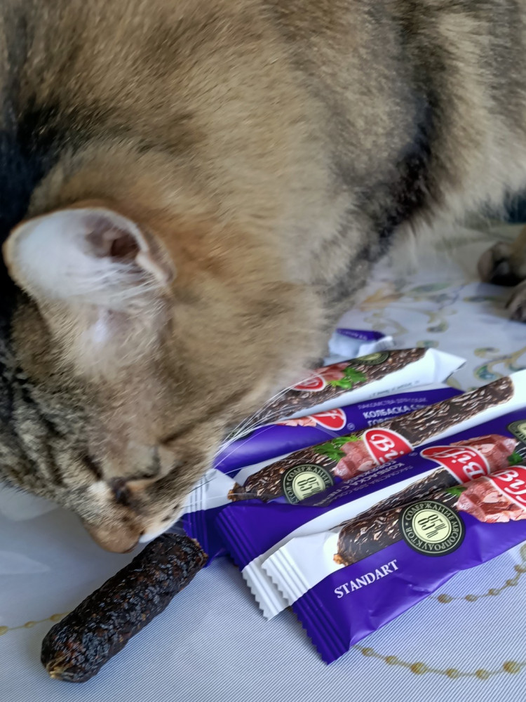 Получила сегодня колбаски, половину сразу дала собаке. Ест и даже кажется с удовольствием, колбаски очень вонючие. Кот тоже заинтересовался, но есть не стал, но и покупала не для него))