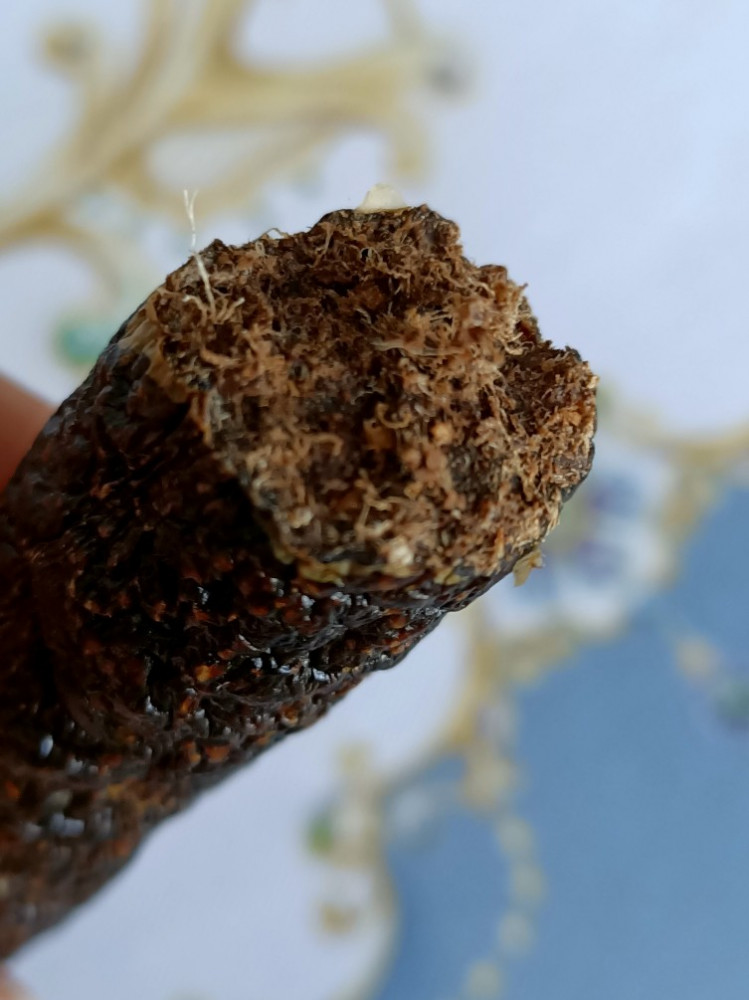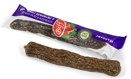 Колбаска большая, сухая. Ломается легко. Даю йорочке по небольшому кусочку. Пока нравится.