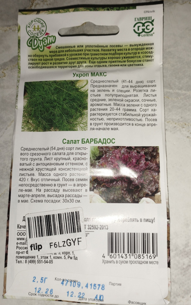Гавриш Набор семян. Салат «Барбадос». Укроп «Макс»-40% +6 срок годности индивидуальная упаковка количество укропа