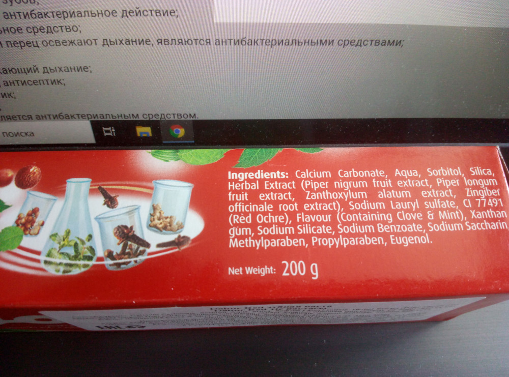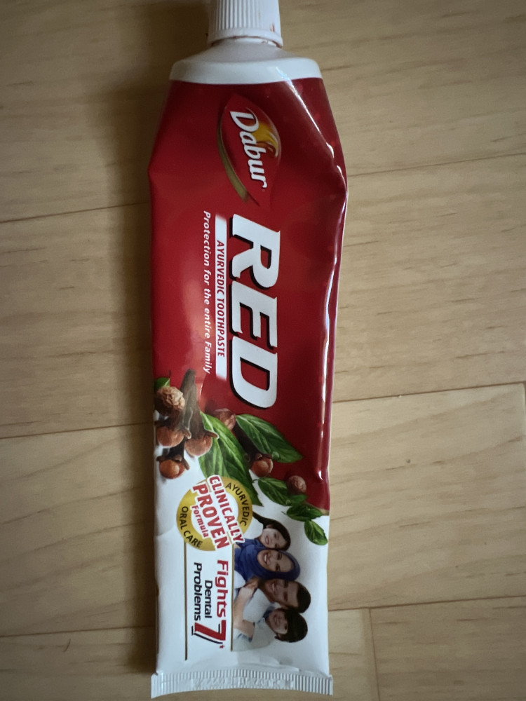 Зубной пастой "Red" фирмы "Dabur" пользуюсь давно. Работая продавцом-консультантом в индийском магазине услышала много положительных отзывов о данной пасте (ранее сама ею не пользовалась) приобрела и себе. Теперь могу подтвердить, что паста действительно отличная. Обратите внимание, что пасты необходимо совсем немного. Я сначала взяла с горошину, но и этого оказалось много. Теперь беру меньше, чем с горошину. Цветом паста красного цвета, так как содержит в себе корицу и красный перец, кроме других полезных трав таких, как: 1. Гвоздика предотвращает разрушение зубов. 2. Мята оказывает противогрибковое и антибактериальное действие. 3. Корень сутхи — антибактериальное и противовоспалительное средство. 4. Длинный перец (пиппали) и чёрный перец освежают дыхание, являются антибактериальными средствами. 5. Лаванга — облегчает зубную боль. 6. Томар — антисептик, также освежающий дыхание. 7. Камфора — местный анальгетик, антисептик. 8. Карпура — анальгетик, антисептик. 9. Харитаки — вяжущее средство, помогающее при стоматите. 10. Марича освежает дыхание, является антибактериальным средством. Применение зубной пасты Dabur Red обеспечит укрепление зубной эмали.