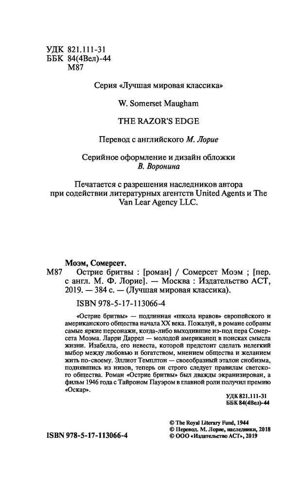 💳 Оплатить за товар можно при получении 🇰🇿 Есть бесплатная доставка по Казахстану от 1 дня 🎁 Копите бонусы с каждой покупки Серия: Лучшая мировая классика «Острие бритвы» — подлинная «школа нравов» европейского и американского общества начала XX века. Пожалуй, в романе собраны самые яркие персонажи, когда-либо выходившие из-под пера Сомерсета Моэма. Ларри Даррел — молодой американец в поисках смысла жизни. Изабелла, его невеста, которой предстоит сделать нелегкий выбор между любовью и богатством, мнением общества и желанием жить по-своему. Эллиот Темплтон — своеобразный эталон снобизма, поднявшись из низов, теперь он строго следует правилам светского общества. Роман «Острие бритвы» был дважды экранизирован, а фильм 1946 года с Тайроном Пауэром в главной роли получил премию «Оскар». |