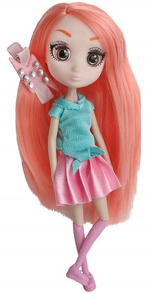 Мики выглядит потрясающе в своем оригинальном костюме, представленном кофточкой темно-бирюзового цвета и короткой розовой юбочкой в складочку. У куклы оригинальный цвет волос — коралловый. Волосы длинные, ниже колен, прямые и густые, их можно причесывать, заплетать в красивые косички и создавать креативные прически. Волосы украшает красивая заколочка розового цвета с основанием в виде молнии с блестящими стразами. Заколка станет приятным подарком для будущей обладательницы куклы, пригодится для создания разнообразных причесок.