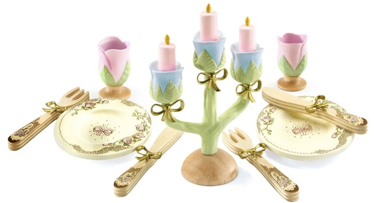 Посуда красиво оформлена: чашки представляют собой бутончики роз, канделябр — цветущее растение, а столовые приборы и тарелки декорированы бантиками и интересным узором. Играя с набором, ребенок сможет поближе познакомиться с различными элементами посуды, а также пофантазирует, придумывая увлекательный сюжет, позволяющий их использовать. Также набор пойдет для различных сюжетно-ролевых игр в кафе или ресторан.