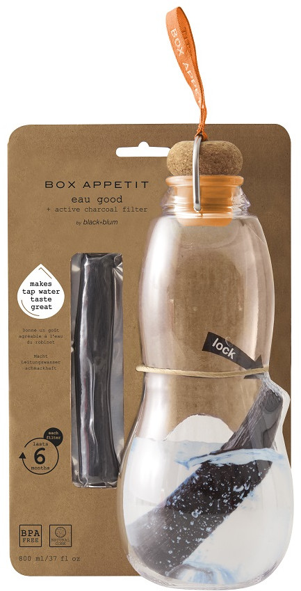 Эко-бутылка объемом из тритана с крышкой из натуральной пробки и угольным фильтром в комплекте. Материалом для бутылки служит экологически безопасный тритан, искусно имитирующий стекло, но гораздо более прочный и устойчивый к царапинам. Крышка из натуральной пробки снизу покрыта мягким силиконом и фиксируется к корпусу при помощи стального зажима, украшенного цветной матерчатой лентой для переноски. В корпусе имеется специальное углубление для фирменного угольного фильтра Binchotan, который входит в комплект.