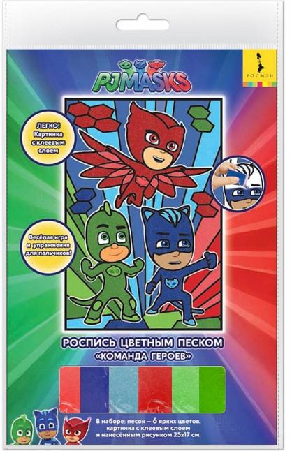 Роспись цветным песком «Команда героев» — это отличное средство надолго увлечь ребенка, развивая у него тонкую пальцевую моторику, цветовое и тактильное восприятие, внимание, восприятие части и целого, усидчивость и аккуратность.