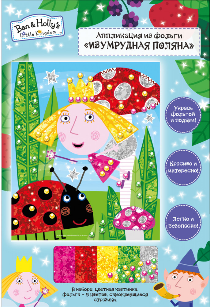 Ben & Holly's Little Kingdom Роспись фольгой «Изумрудная поляна»В данный момент этот товар отсутствует в продаже. Возможно, у нас найдется аналогичный или похожий товар здесь. Окунитесь вместе со своим ребенком в мир изящного творчества! Раскрасьте картинку цветной фольгой — без ножниц и клея. Для этого выберите деталь белого цвета (начинайте с крупных фрагментов), снимите с нее защитную пленку и приложите цветную фольгу оборотной стороной к клеевому слою картинки. Старательно потрите ее палочкой или тыльной стороной карандаша и снимите фольгу: ее блестящий слой перейдет на бумагу. Раскрасьте так всю картинку разными цветами и украсьте блестящими разноцветными стразами. Эффектная поделка готова! Благодаря такой работе, ребенок узнает о свойствах голографической фольги и будет развивать мелкую моторику, цветовосприятие и творческое мышление. |