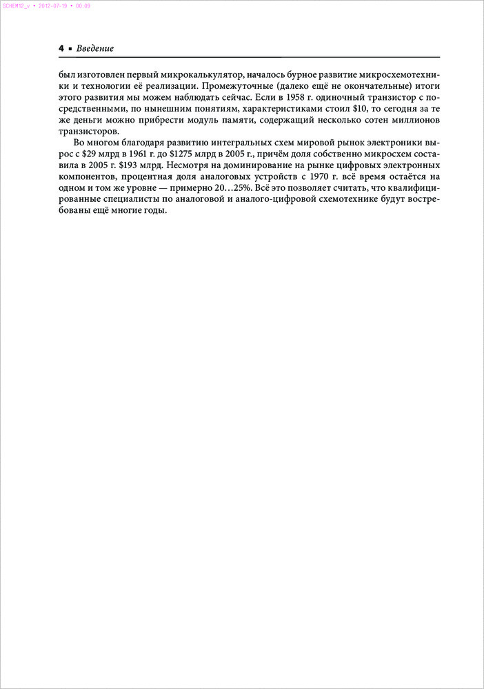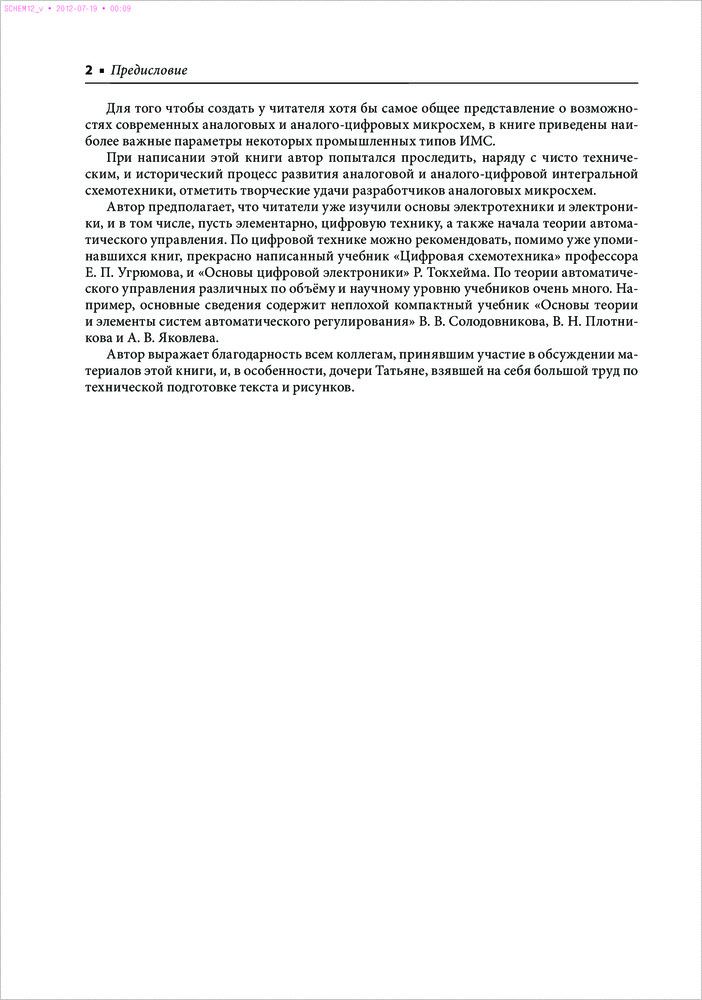 В настоящем издании книга дополнена разделами, в которых описаны полностью дифференциальные усилители, усилители с регулируемым усилением, преобразователи ёмкость-код и интегральные микромеханические гироскопы. Значительно расширена теоретическая часть, касающаяся цифро-аналогового и аналого-цифрового преобразования. Добавлен материал по прецизионным ограничителям, многодатчиковым измерительным мостам, измерению тока, светодиодным драйверам. Расширены разделы, посвященные источникам тока на ОУ, измерительным усилителям, логарифмическим преобразователям, широкополосным усилителям, скоростным аналоговым компараторам, драйверам МОП-транзисторов, интегральным датчика Холла. Раздел, посвященный устойчивости импульсных преобразователей дополнен моделированием однотактных преобразователей в пакете VisSim. В таблицах и тексте обновлены модели интегральных микросхем. |