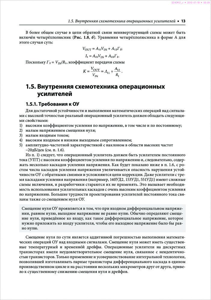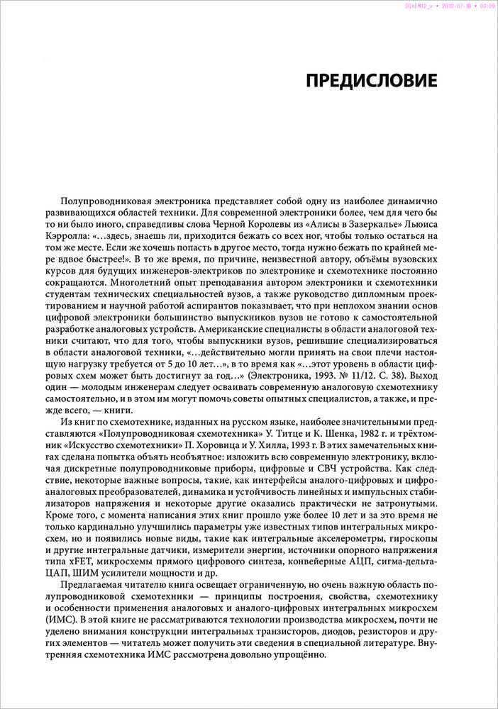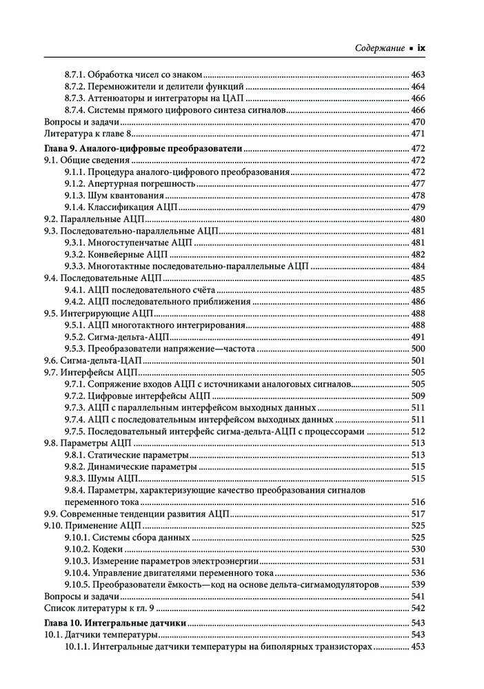 В книге нашли отражение последние достижения в элементной базе, при этом основное внимание уделено схемотехнической реализации различных функций электронных устройств. Рассмотрены схемы линейного и нелинейного преобразования сигналов, измерительные и вычислительные схемы, активные электрические фильтры, генераторы и перемножители сигналов, специализированные усилители (широкополосные, изолирующие, измерительные и др.), источники опорного напряжения, различного типа цифроаналоговые и аналого-цифровые преобразователи, схемы датчиков температуры, ускорения, давления, влажности, магнитного поля.