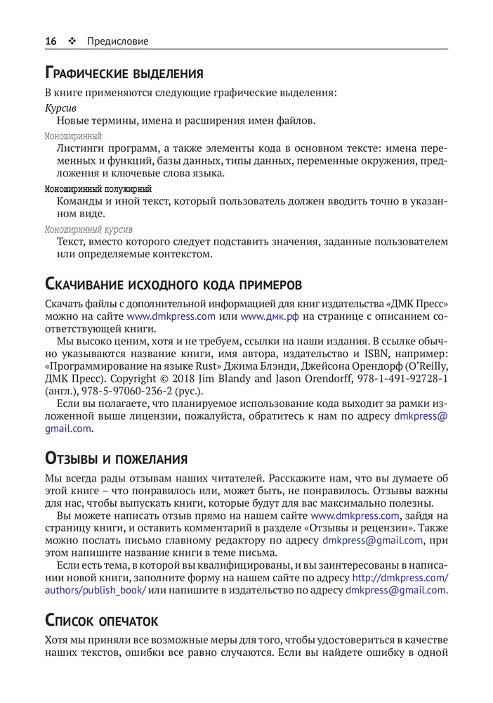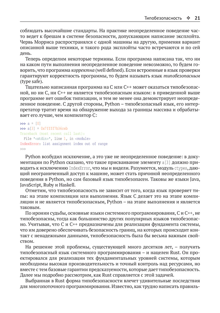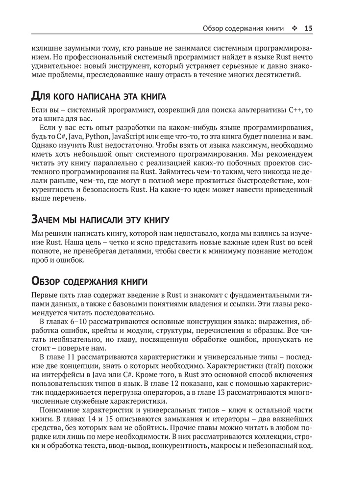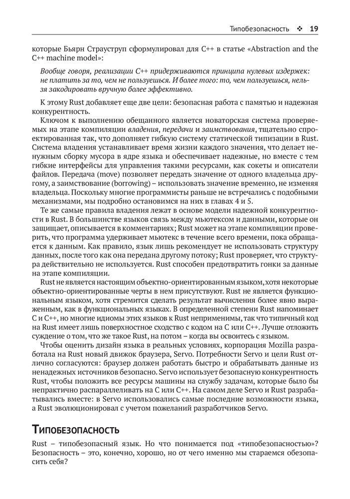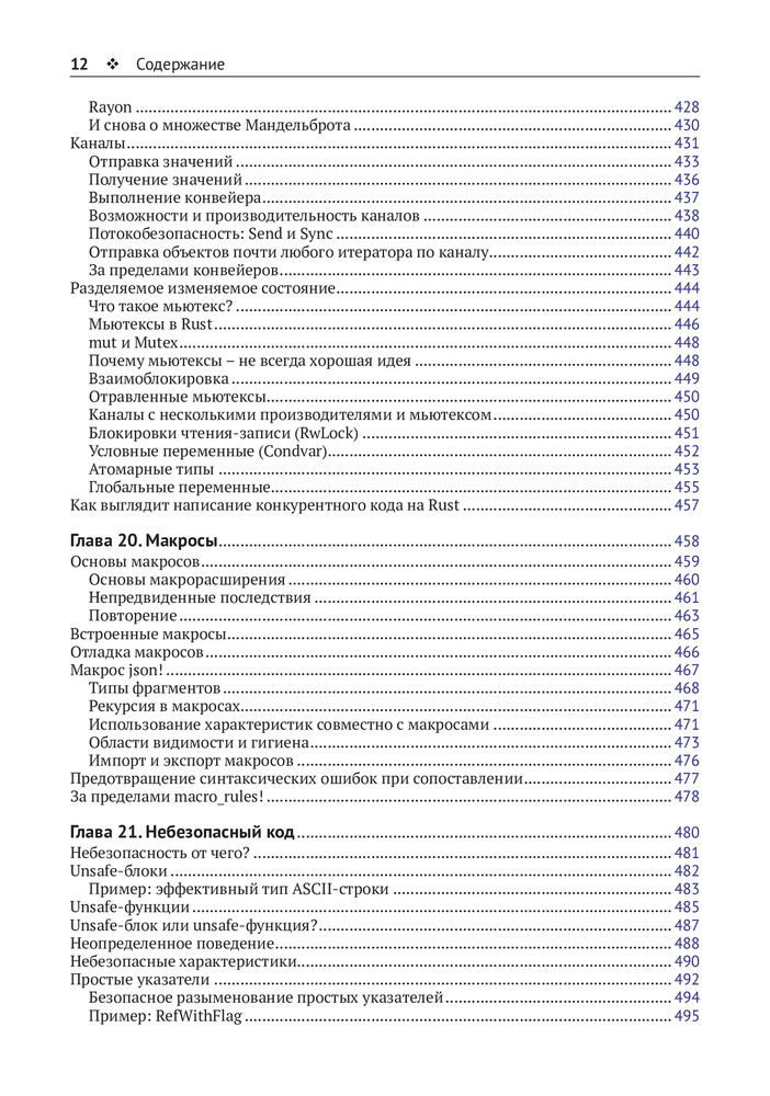 Rust — новый язык системного программирования, сочетающий высокую производительность и низкоуровневый контроль, характерные для С и C++, с безопасной работой с памятью и потоками. В начале книги рассмотрены типы данных и основные конструкции языка — выражения, модули, структуры, перечисления и образцы. Далее описываются характеристики и универсальные типы. В следующих главах приводятся сведения о замыканиях и итераторах. Наконец в последних главах книги вы найдете исчерпывающую информацию о коллекциях, обработке текста, вводе-выводе, конкурентности, макросах и небезопасном коде. |