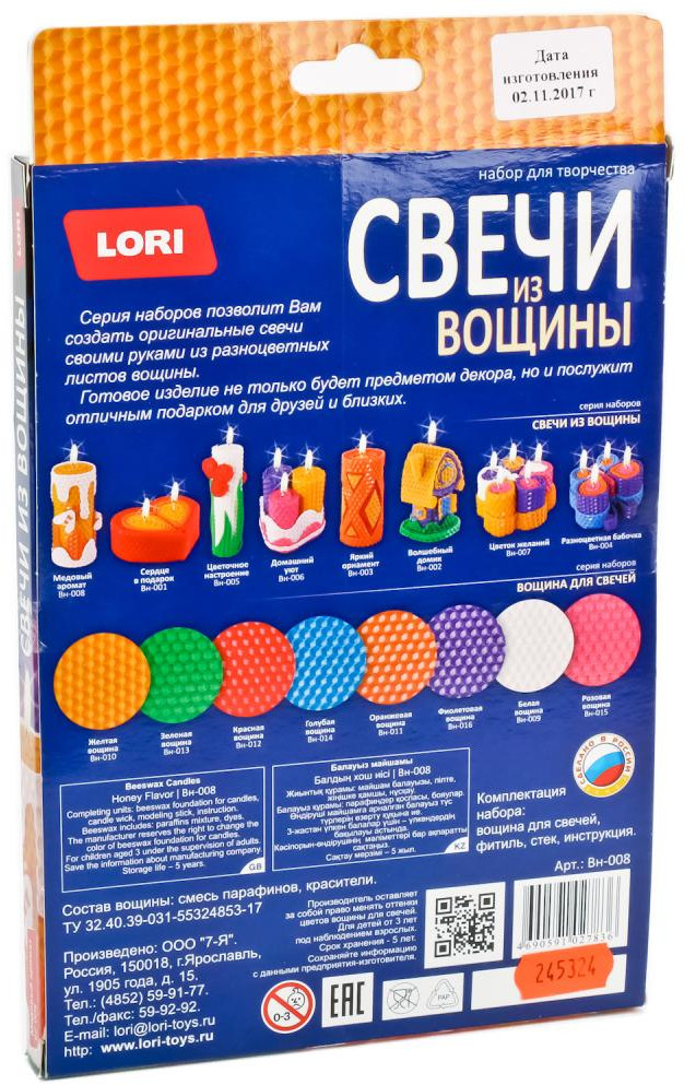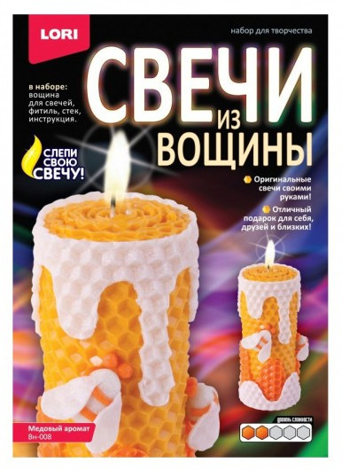 Вощина от Lori — отличный материал для создания свечей: мягкий, пластичный, легко приобретает нужную форму. Серия наборов позволит Вам создать оригинальные свечи своими руками из разноцветных листов вощины. Готовое изделие не только будет предметом декора, но и послужит отличным подарком для друзей и близких.